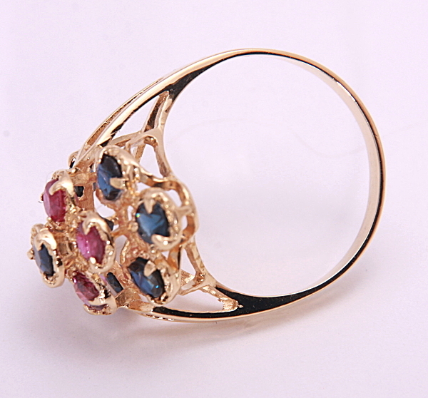 ラウンドカットのルビーとサファイアが留められたリングです。