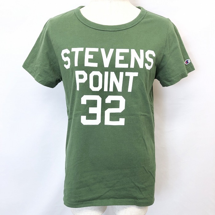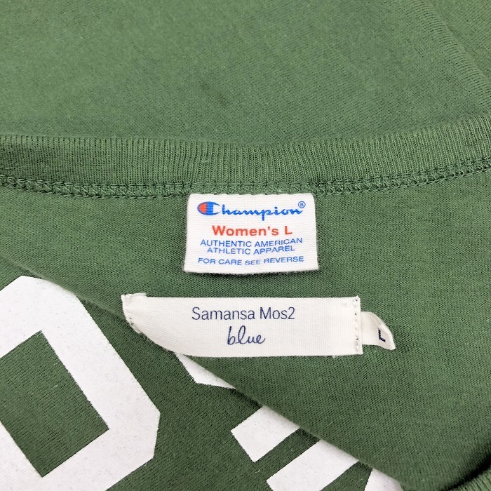商品タイトル | Samansa Mos2 blue × Champion サマンサモスモスブルー×チャンピオン L レディース Tシャツ 英字プリント コラボ 半袖 綿100% 杢グリーン |