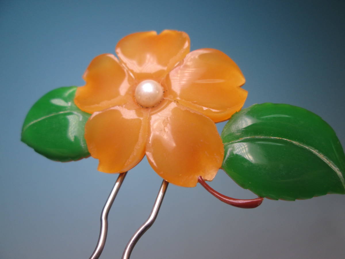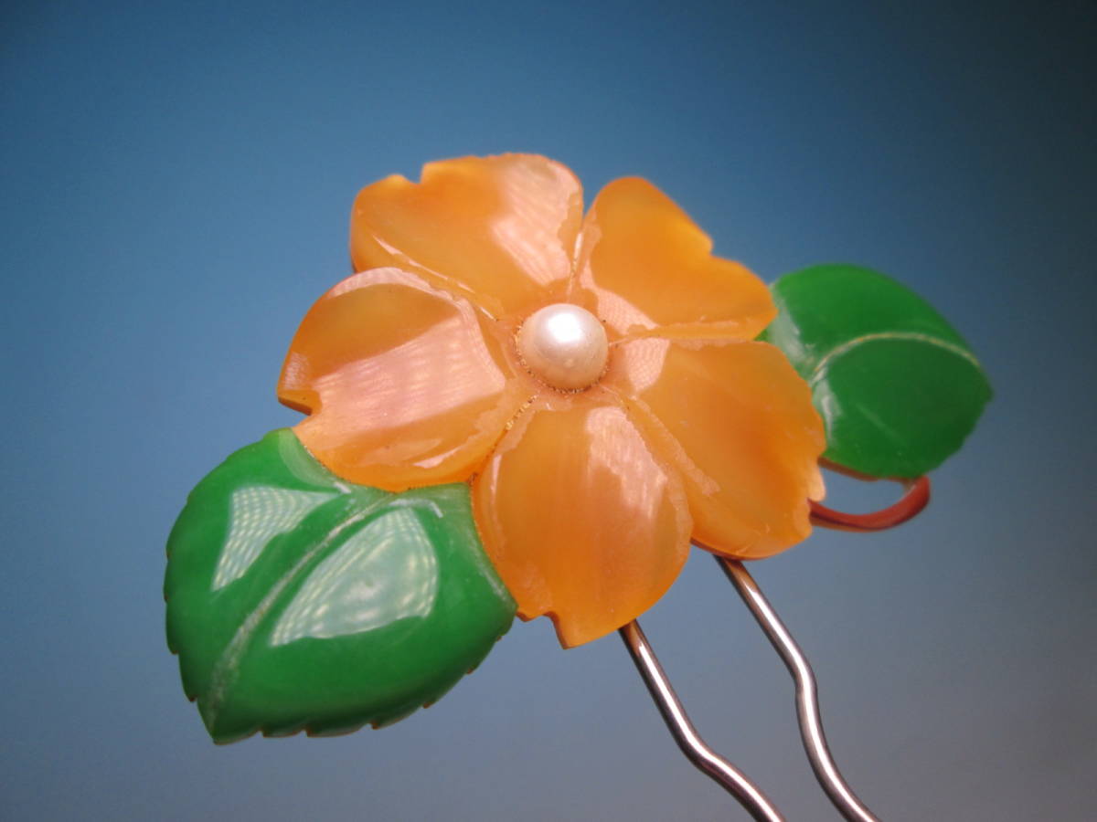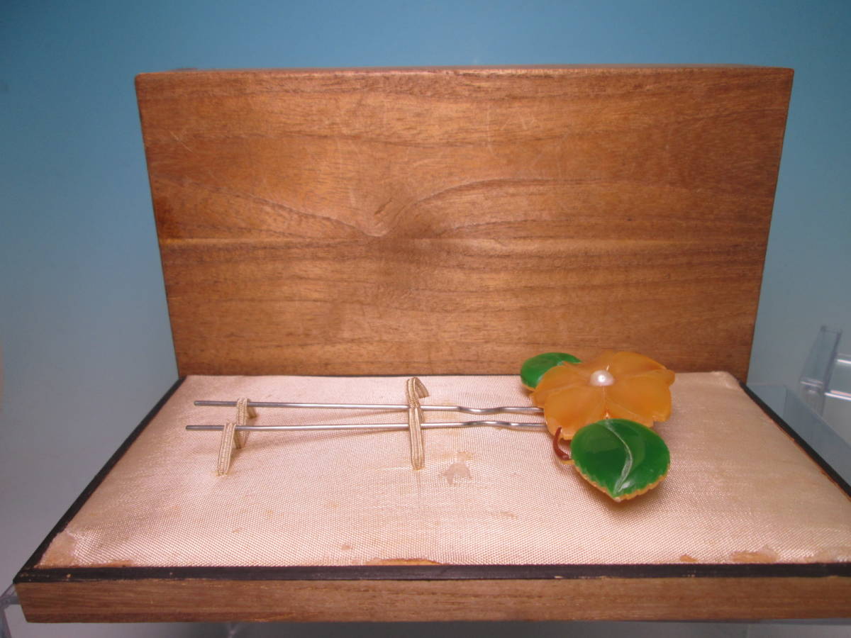 【江月】 アンティーク・小野春 樹脂製 本真珠飾り花のかんざし 木箱付
