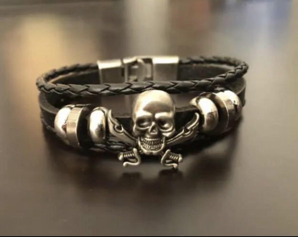 人気の海賊旗、ドクロをモチーフにしたレザーブレスです。