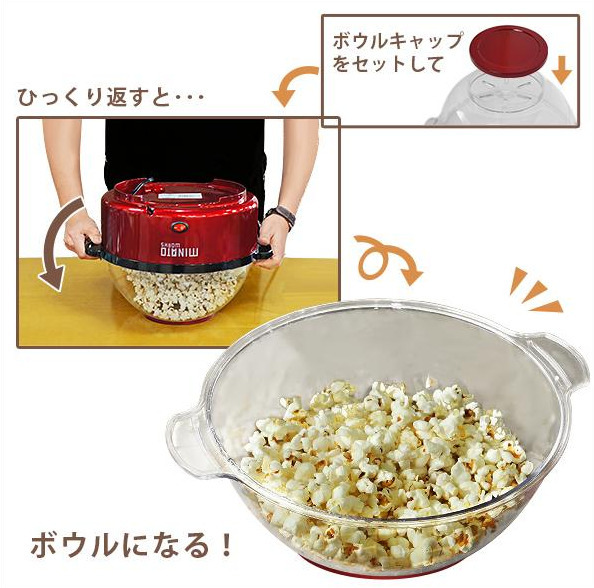 フタをひっくり返せばボウルのかわりになり、できたてのポップコーンをすぐに召し上がれます。