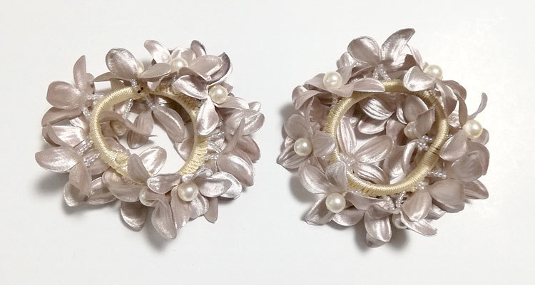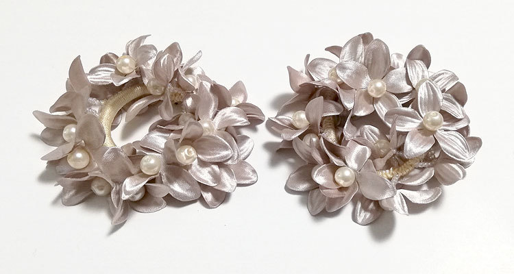 ★シュシュ 髪飾り 光沢 花型 パール ピンクグレー 2個セット 小さめ