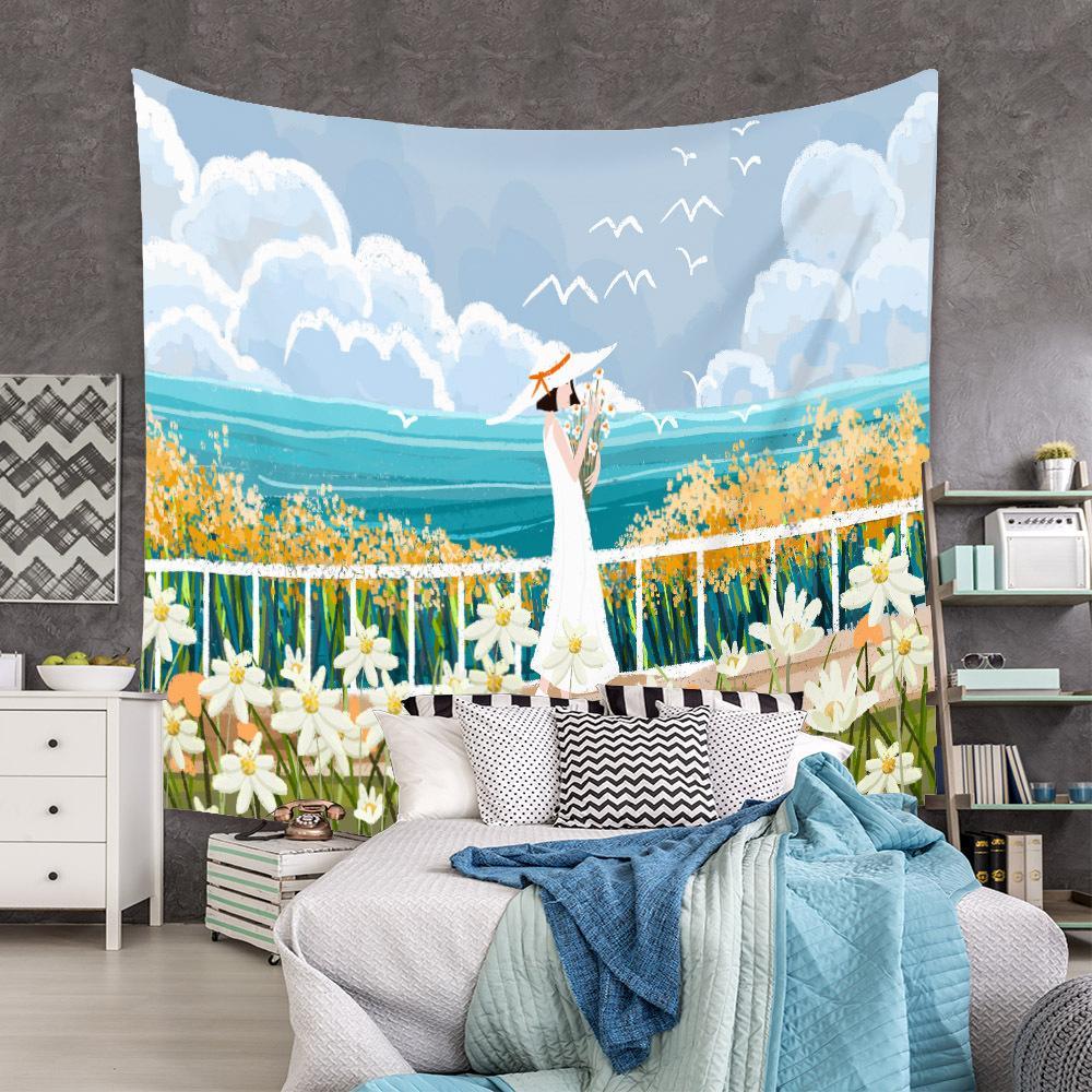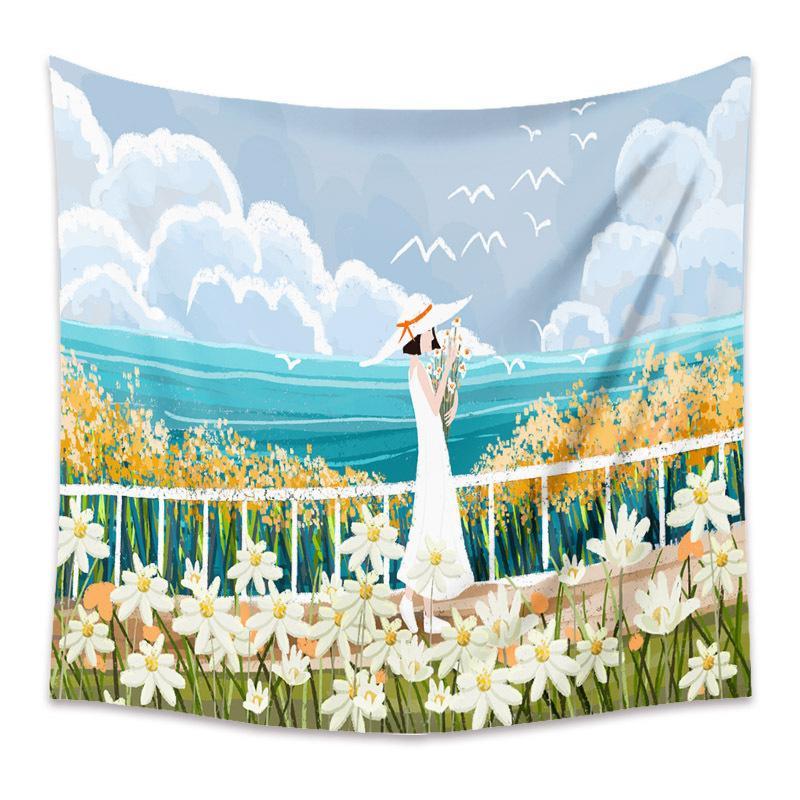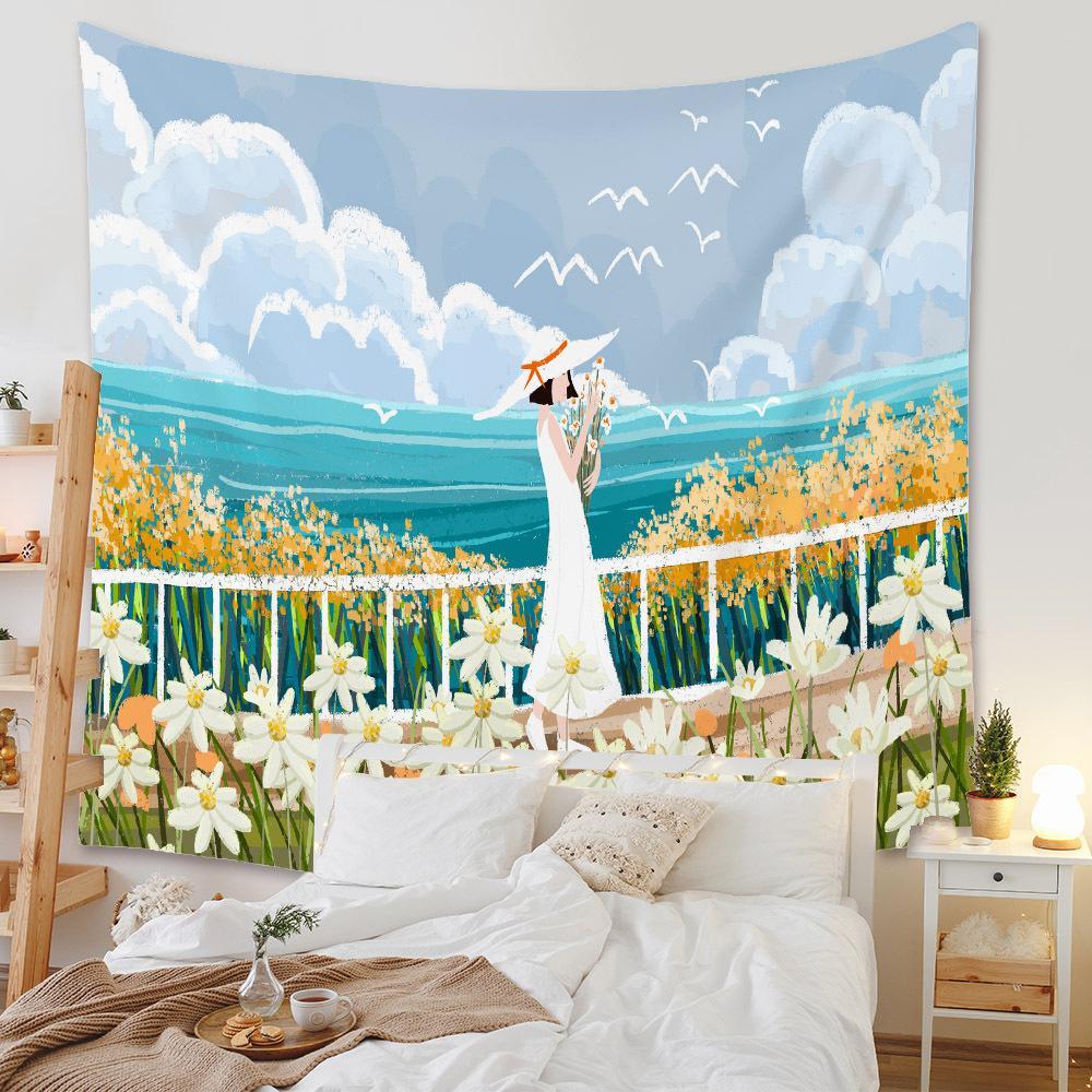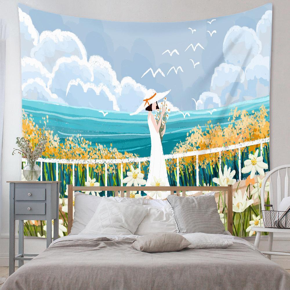 タペストリー金具付F47 夏 少女 花束 海 青空 花畑 壁アート 模様替え
