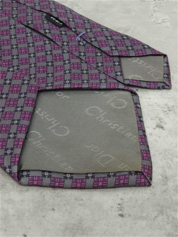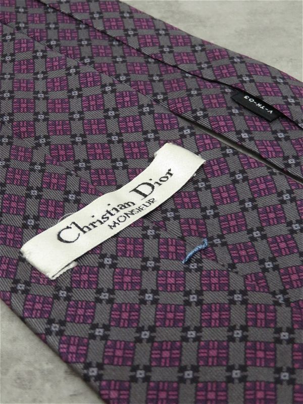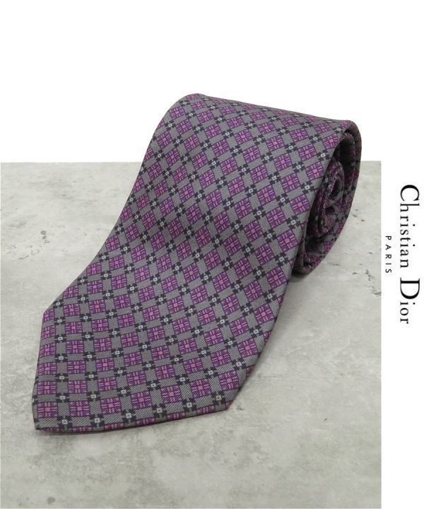RY061/ Christian Dior ネクタイ シルク 剣先幅8cm 総柄 チェック グレー 紫