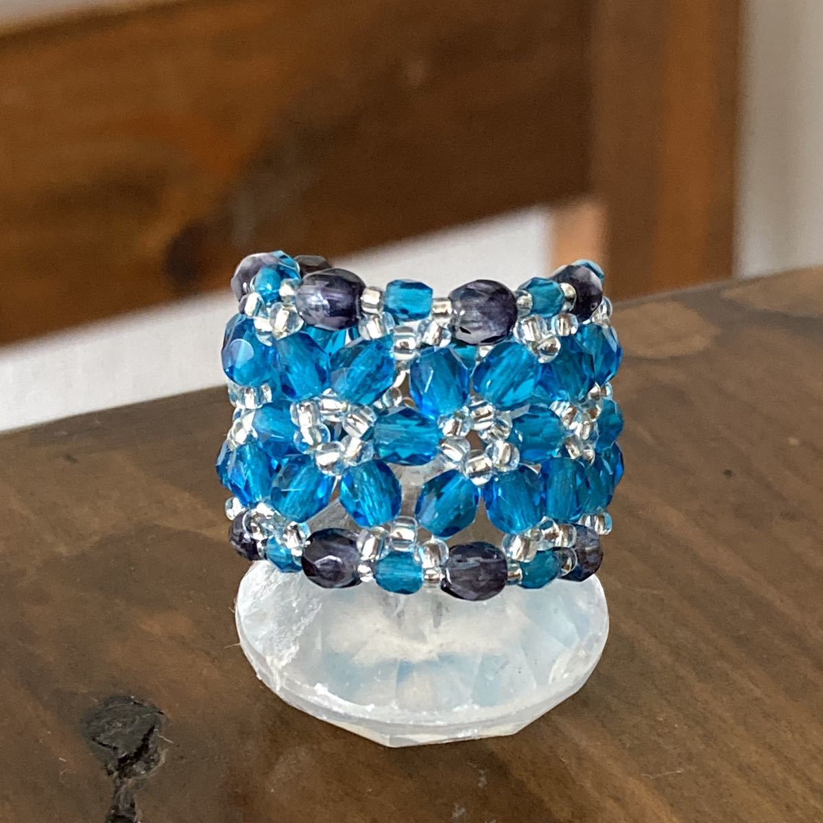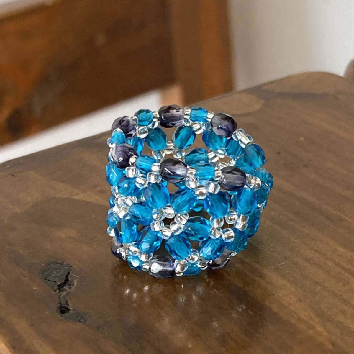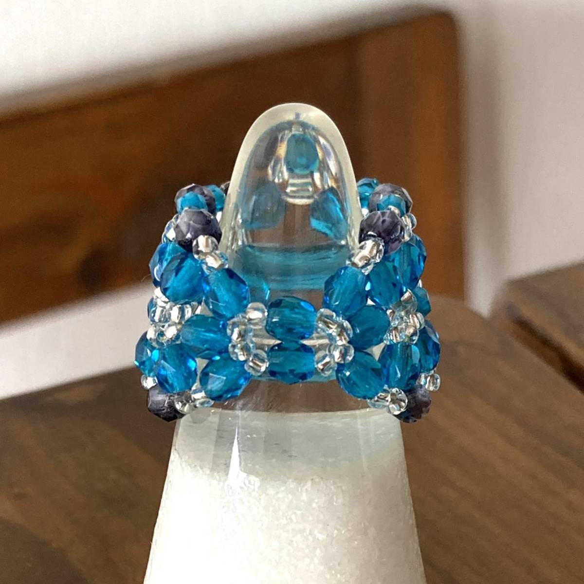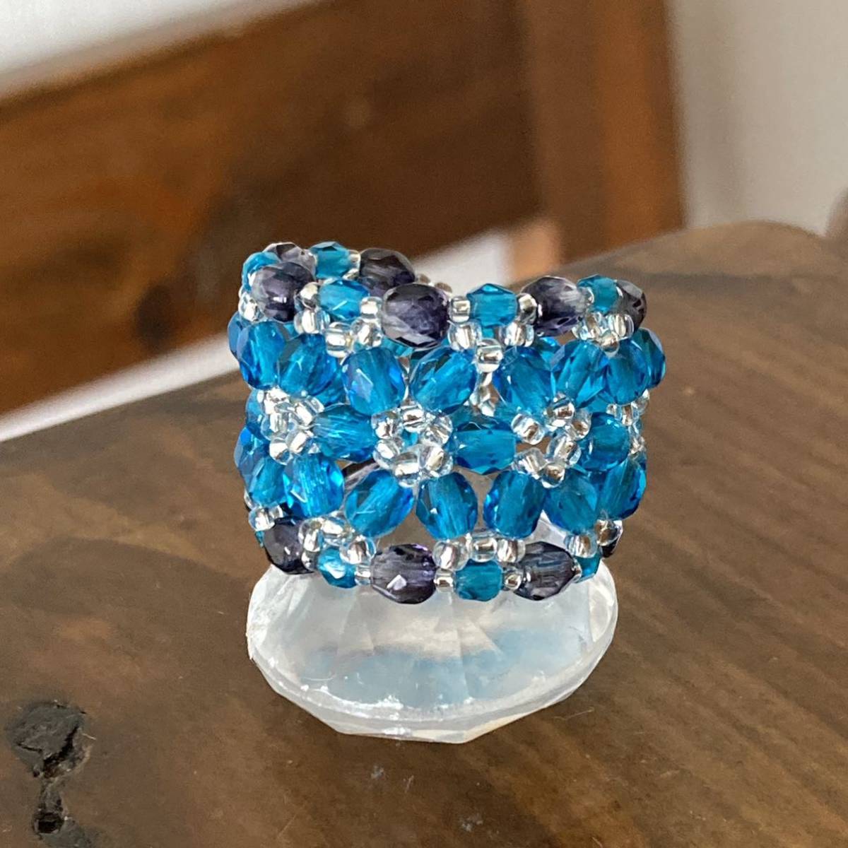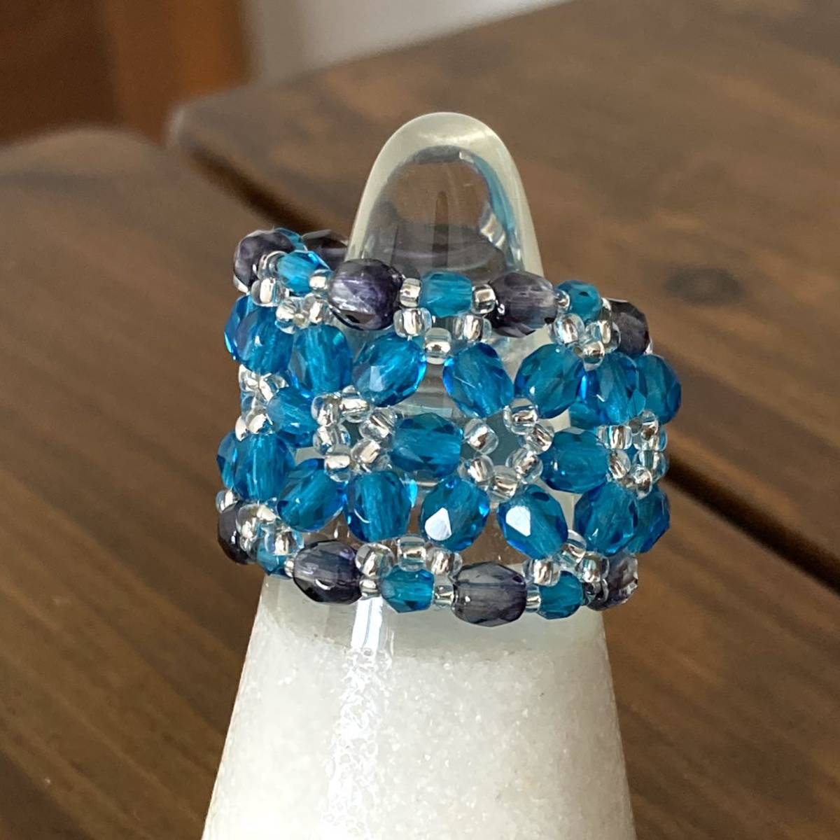 4mmのブルー、クリアネイビーのチェコビーズ、3mmブルーのチェコビーズ、クリアシルバーの丸小ビーズで作ったリングです。
