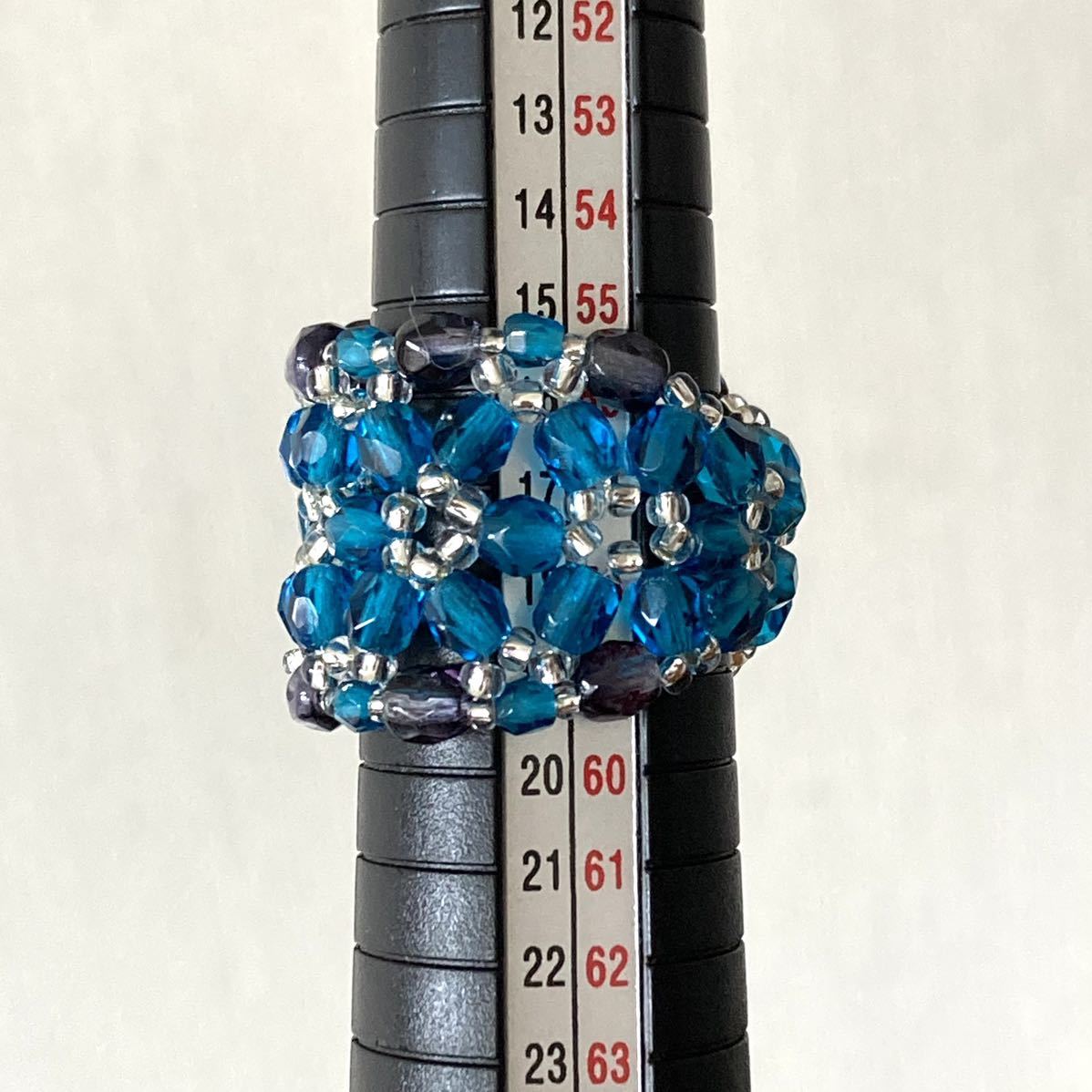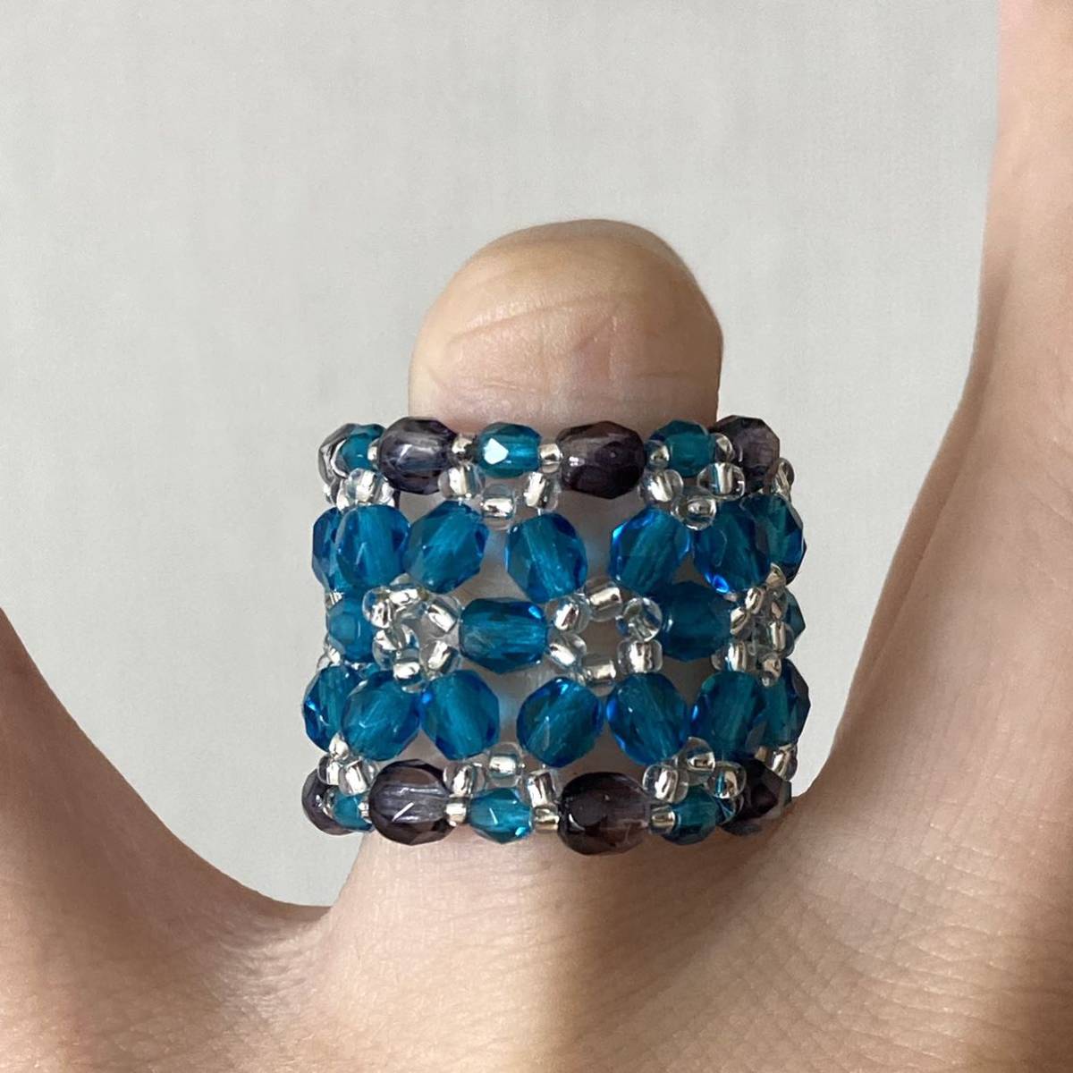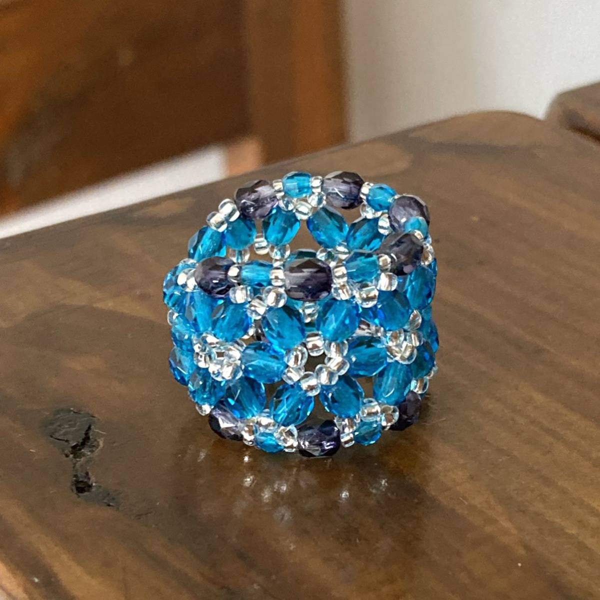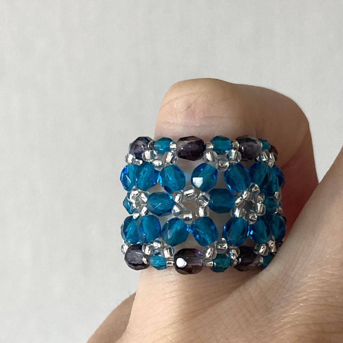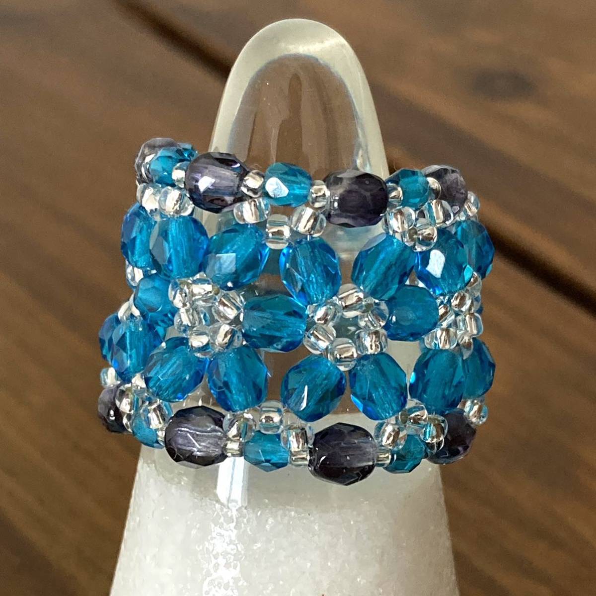 4mmのブルー、クリアネイビーのチェコビーズ、3mmブルーのチェコビーズ、クリアシルバーの丸小ビーズで作ったリングです。