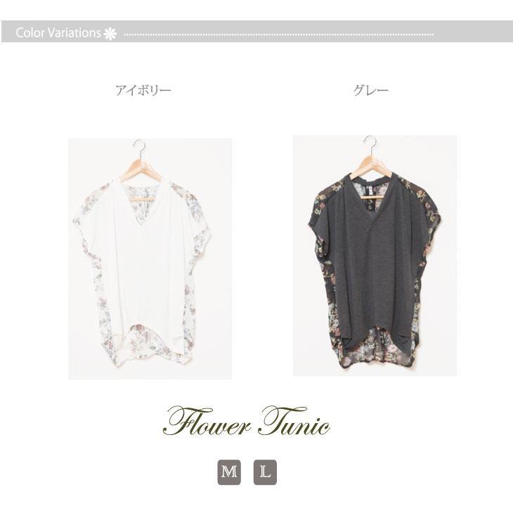M グレー 花柄チュニック トップス 半袖 Vネック レディース 花柄シフォン 新品