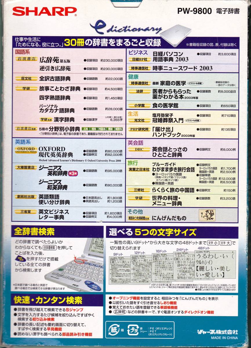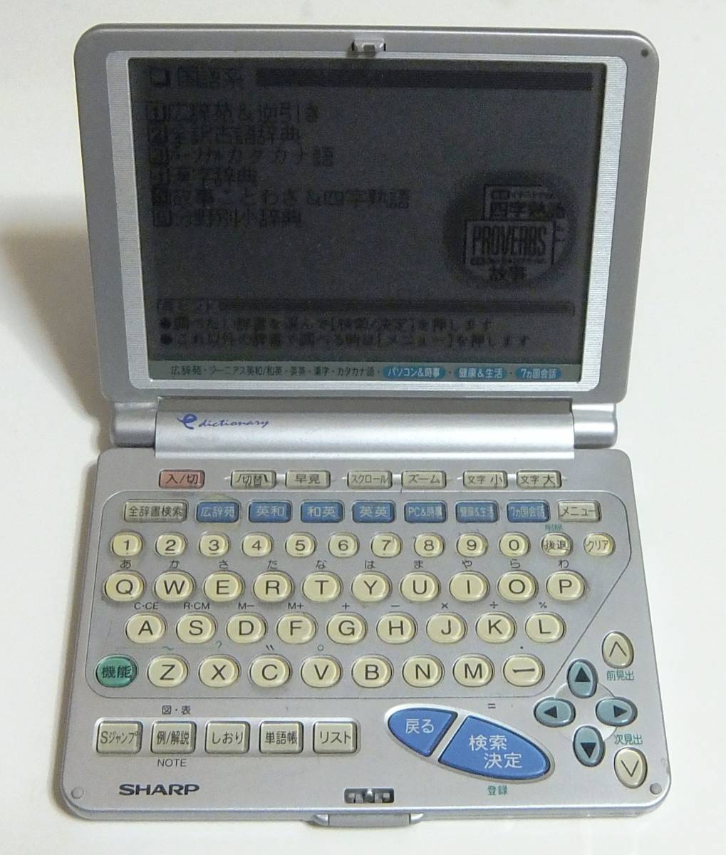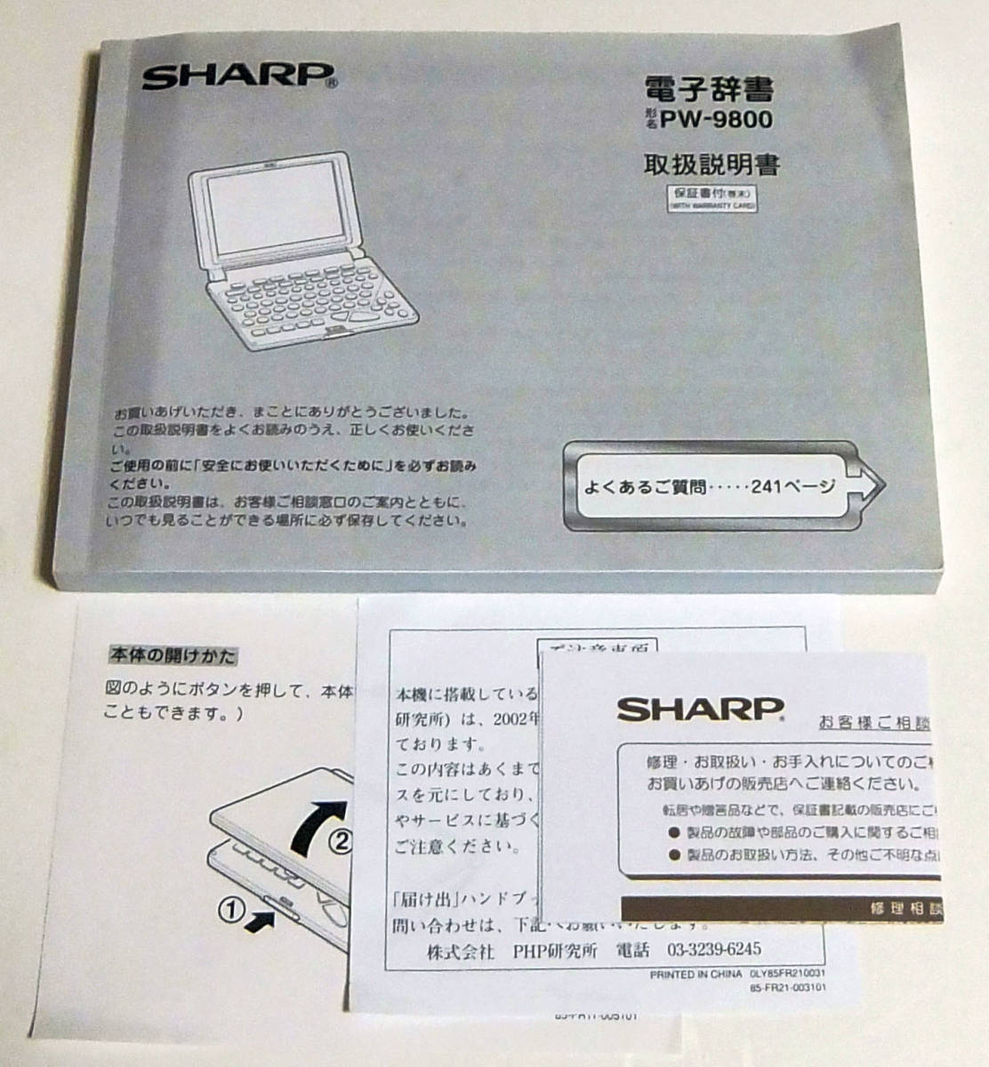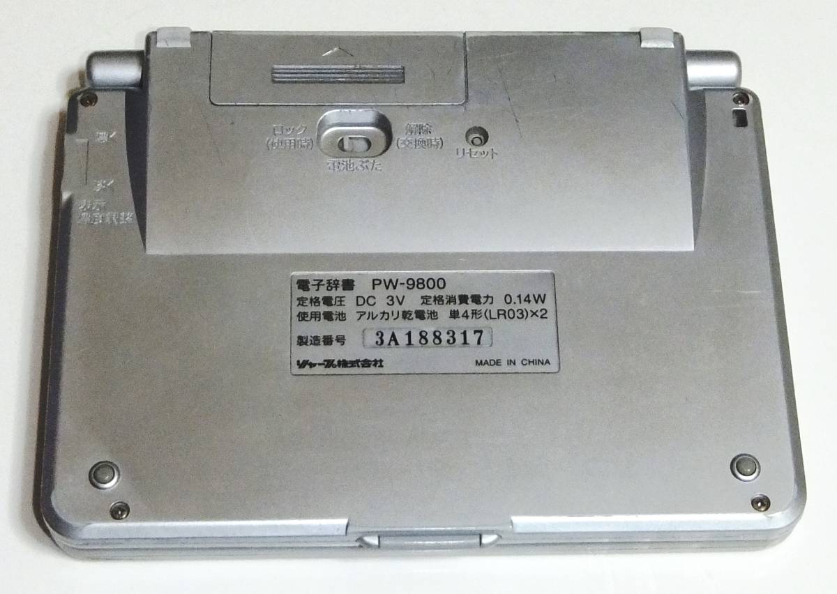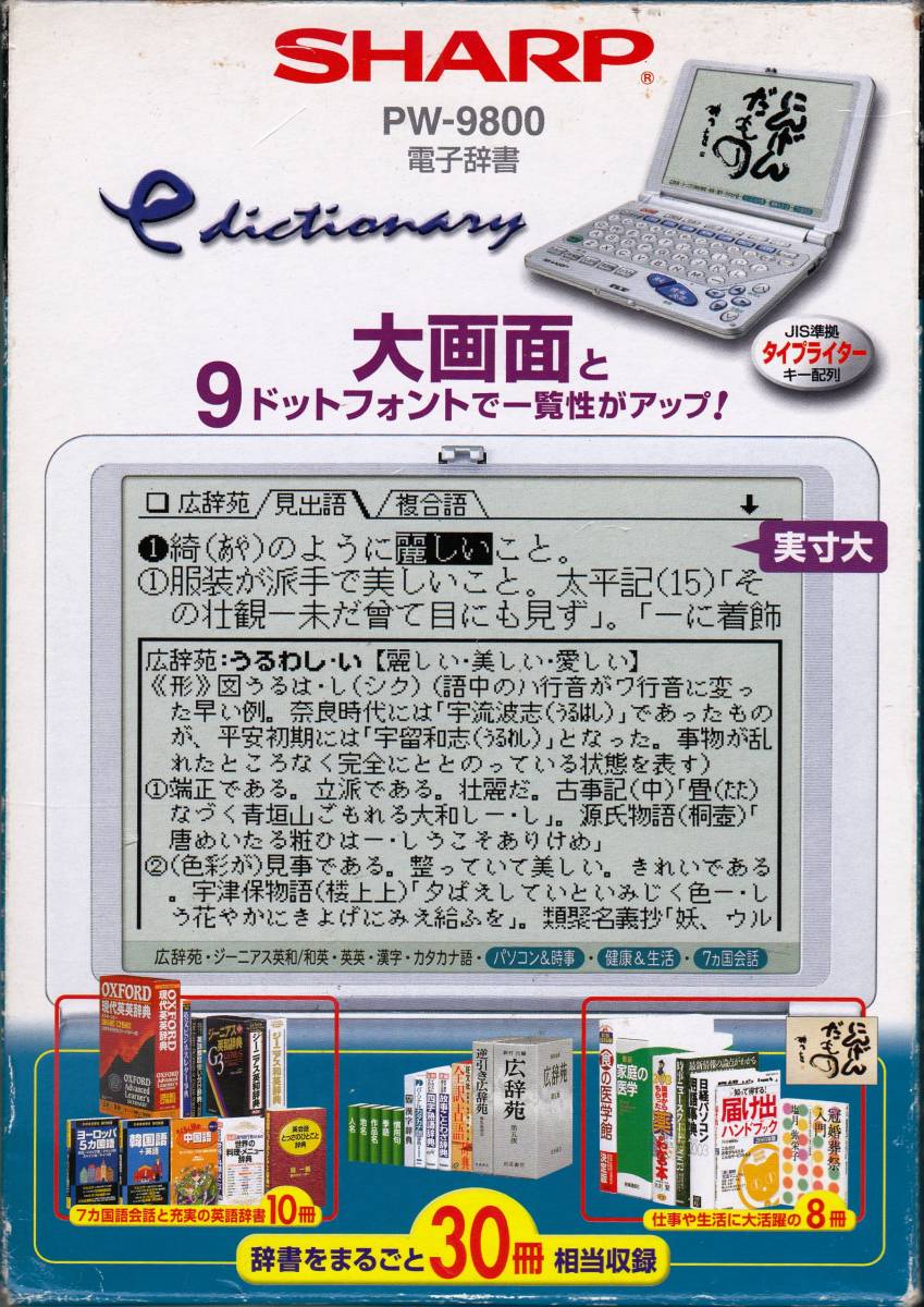 | ◆シャープ電子辞書PW-9800、箱・説完備品です。本体動作を確認しましたが、ボディに傷が多いです。エンブレム破損。左ヒンジ部接着剤で補修(※画像参照)。 |