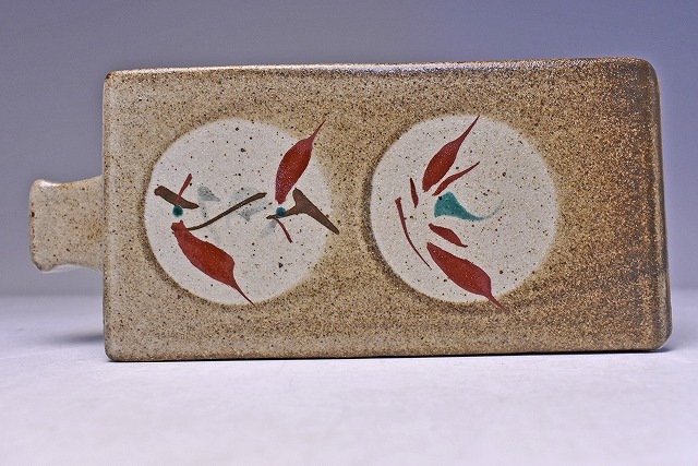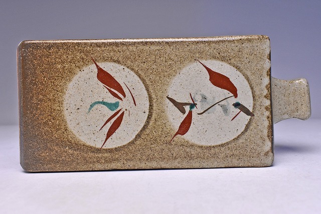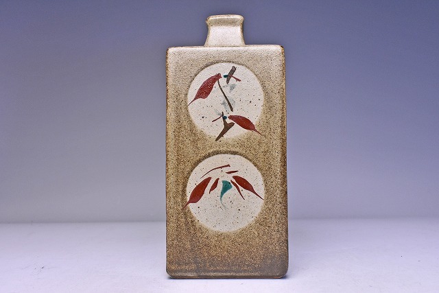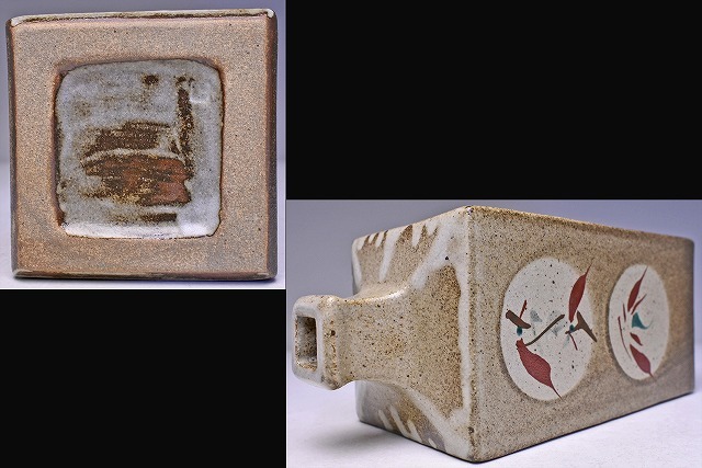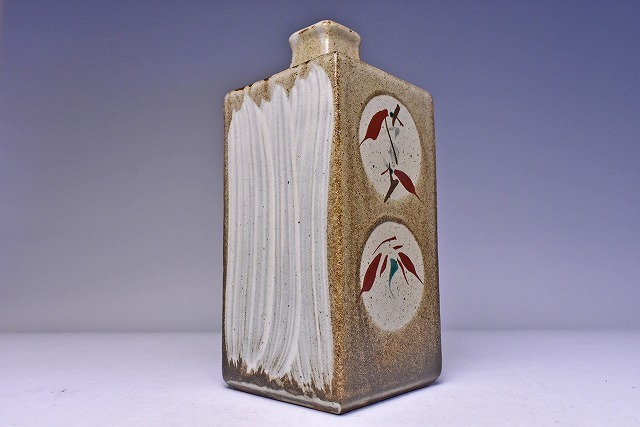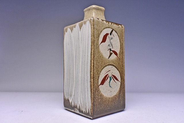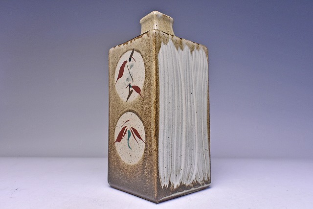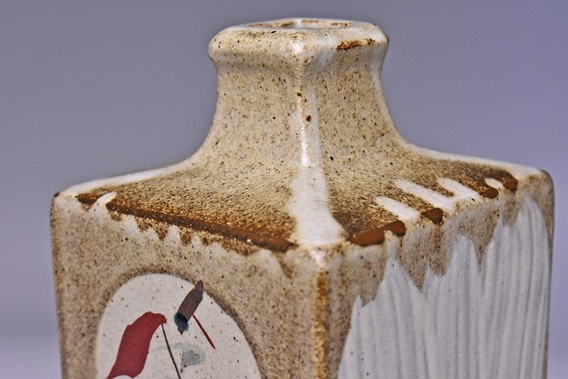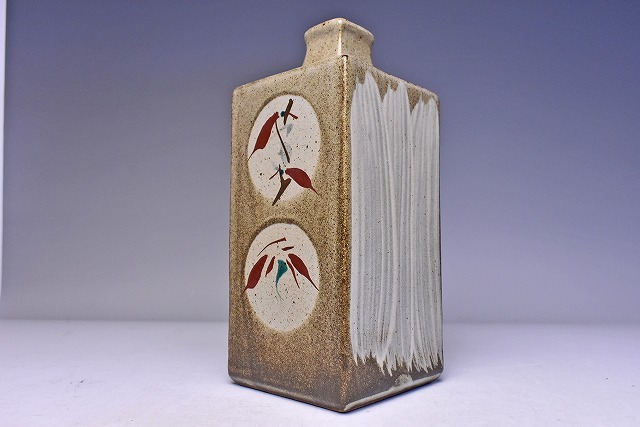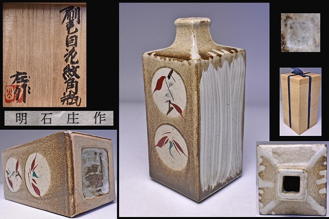 明石庄作 ★ 刷毛目 花紋 角瓶 ★ 共箱 栞 ★ 師:人間国宝 浜田庄司 ★ 窓絵の赤絵が愛らしく雅な逸品 ★ 益子焼 民芸 花入 扁壷 ★