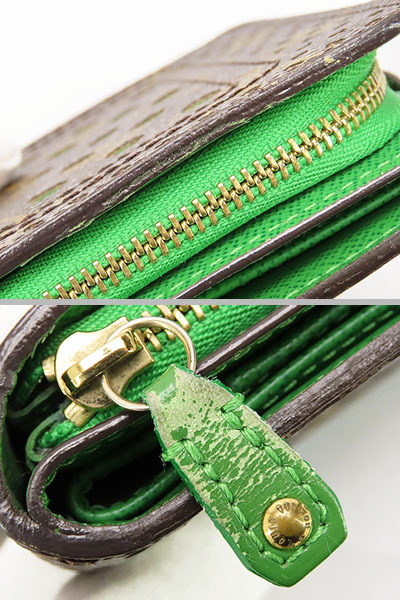 商品状態 | 外側フチのコバにコーティングの割れ、ファスナープルにコーティングの剥がれ、ホックボタンにスレ、カードポケットにカード痕やフチにわずかな裂けがございますが、大きなダメージはなくまだまだご愛用いただけるお品物になります。 |