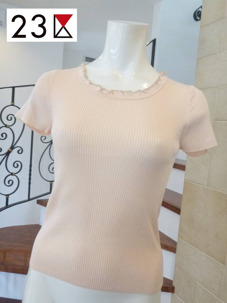 1万 超美品 23区 ★オンワード樫山 ピンク系 サラッとニット フレンチフリル 半袖ニット セーター 32 XS相当