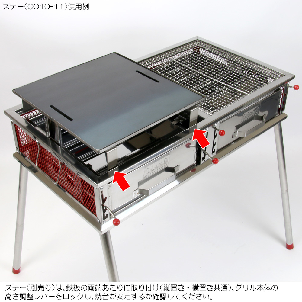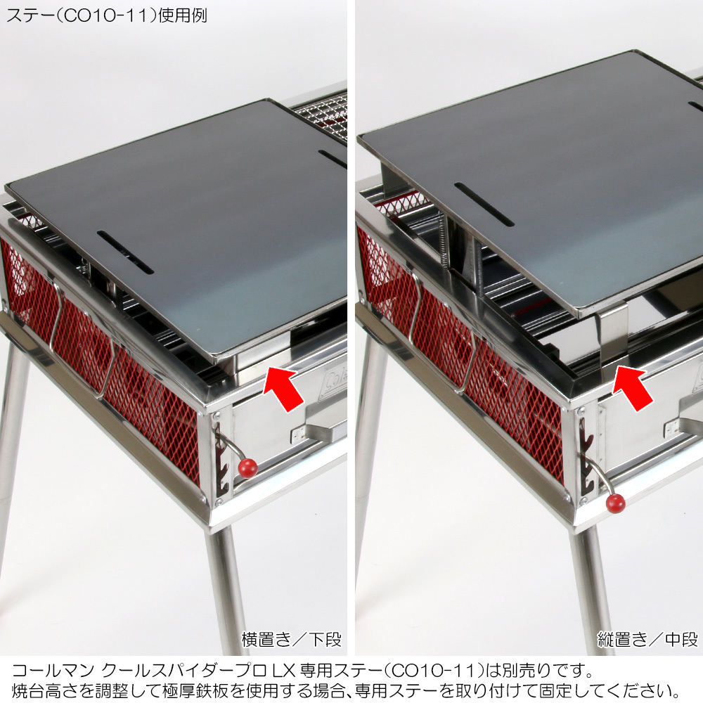 コールマン クールスパイダープロ LX専用の焼台固定用ステー【別売り】をセットすることで、極厚鉄板をご使用の際も3段階に焼面調節が可能で、お好みの火力に調節できます。