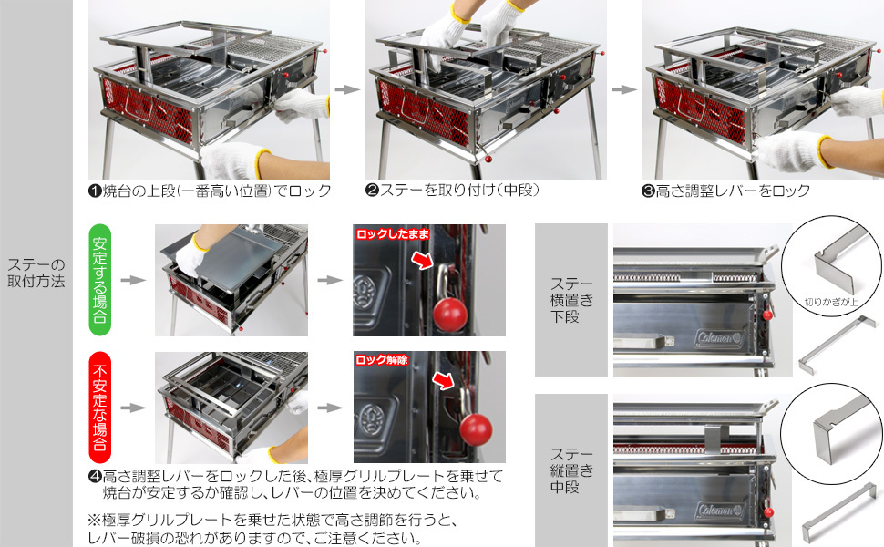 極厚鉄板をご使用の際は、焼台がいちばん低い状態でのご使用か、焼台固定用ステー【別売り】をご使用ください。また、高さ調整を行う場合は鉄板を外した状態で行ってください。