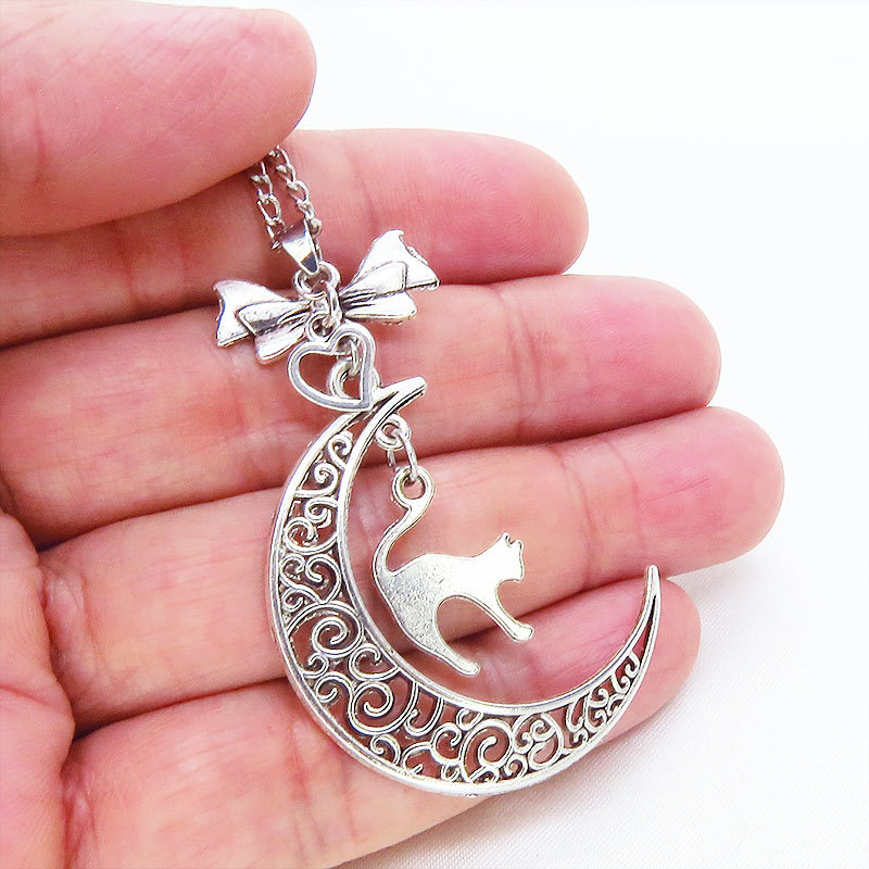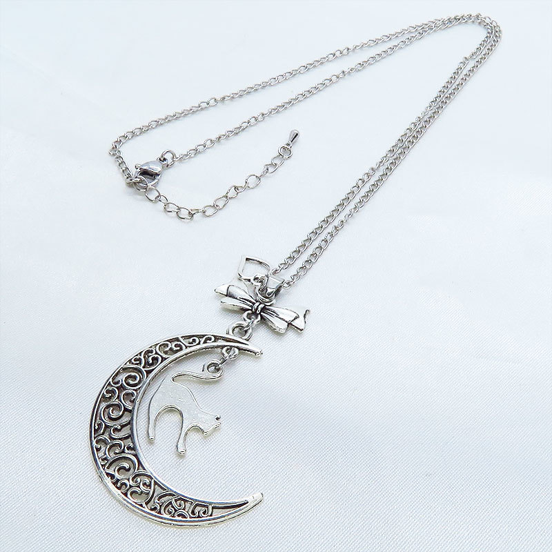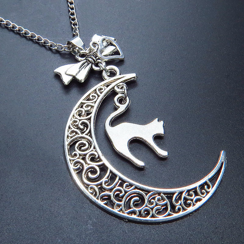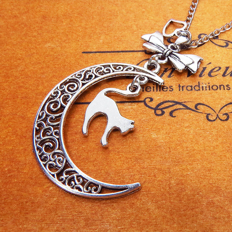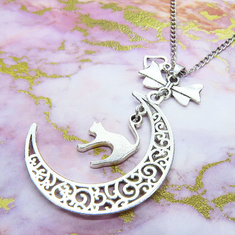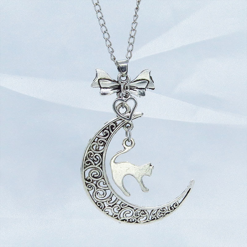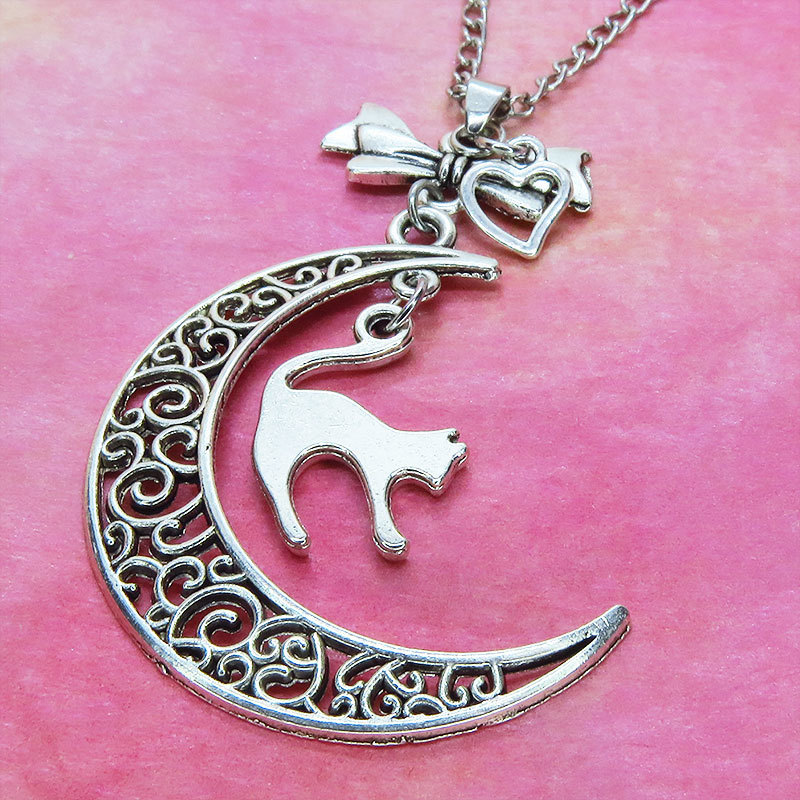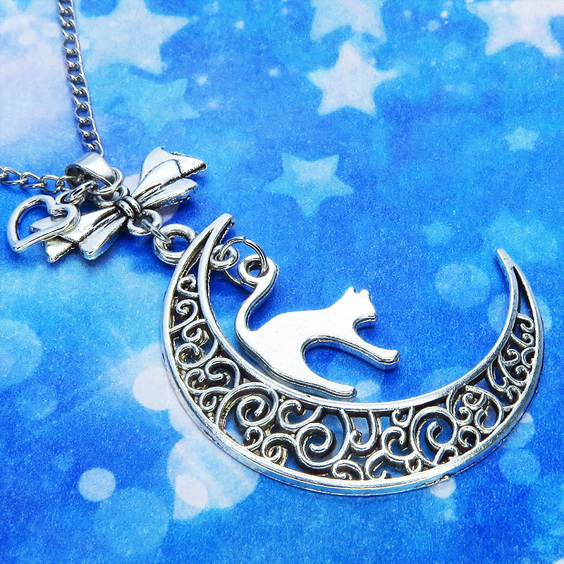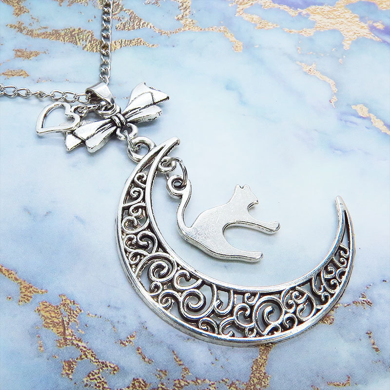 アンティークシルバーの跳ね猫と透かし三日月の大人可愛いネックレス ムーンネックレス リボン ハート 銀古美