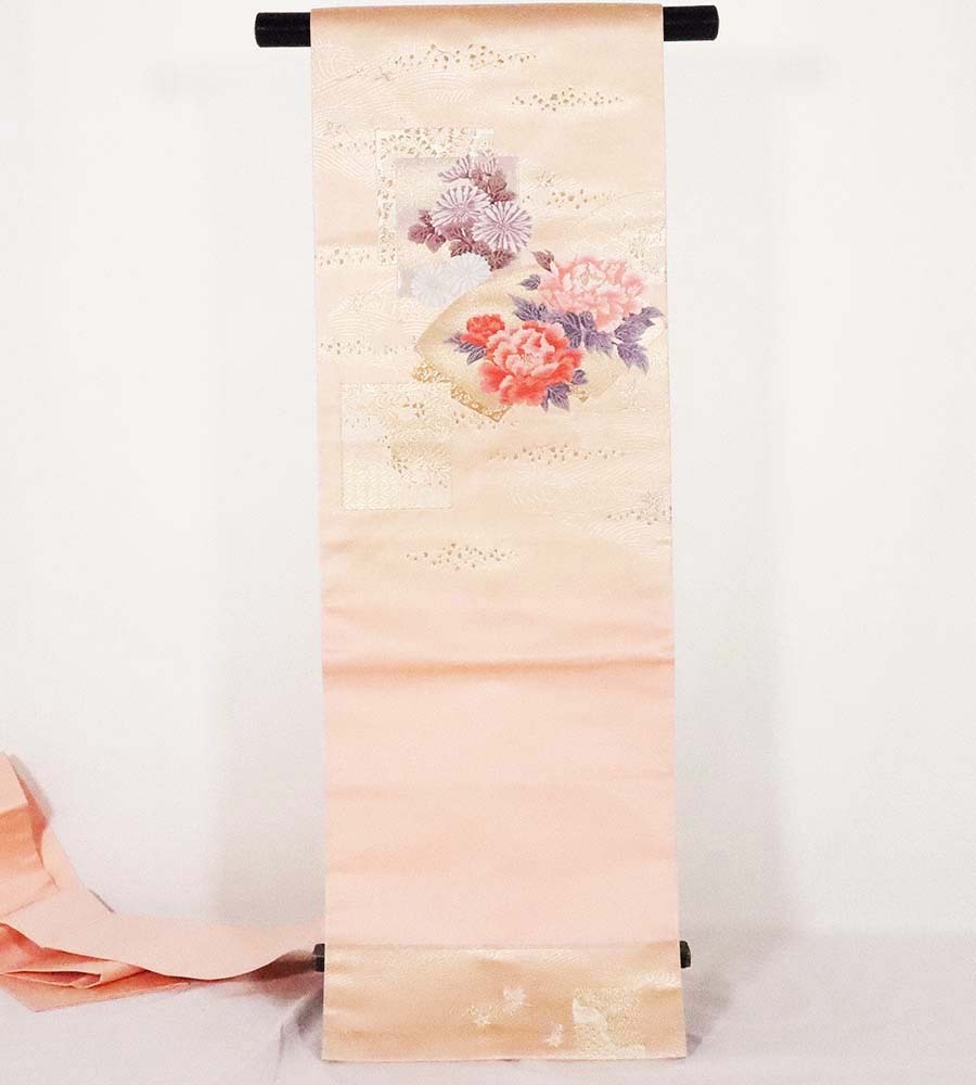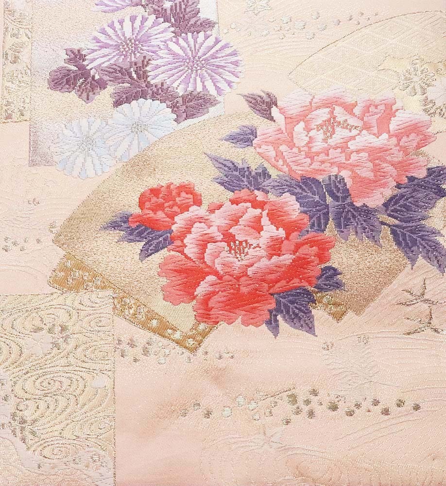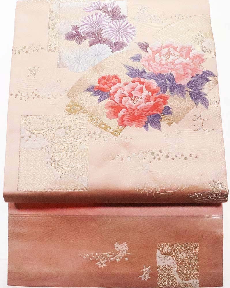 | 西陣織名古屋帯 ピンク・金箔地 縫い取り菊・牡丹・色紙紋・扇文 新品 仕立て上がり | |
