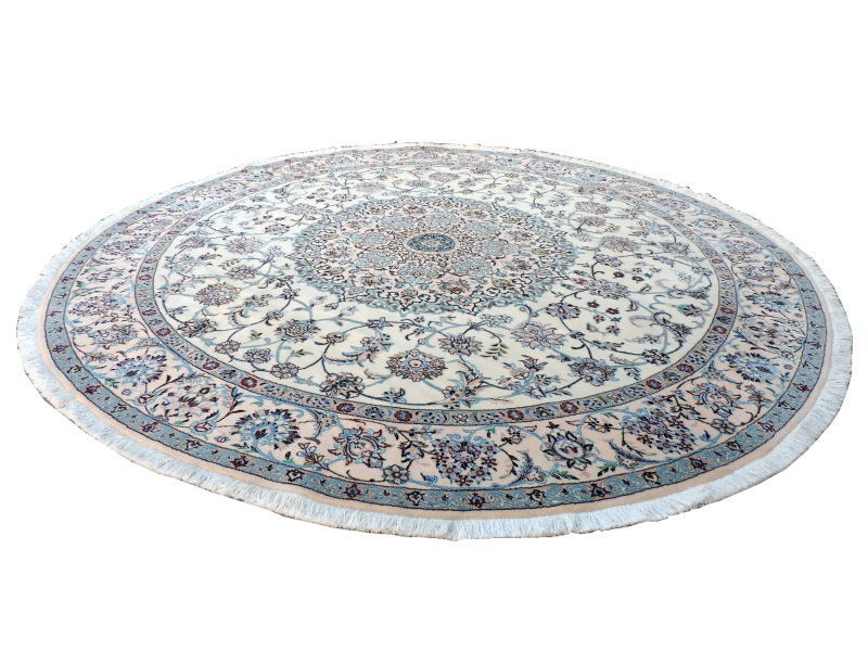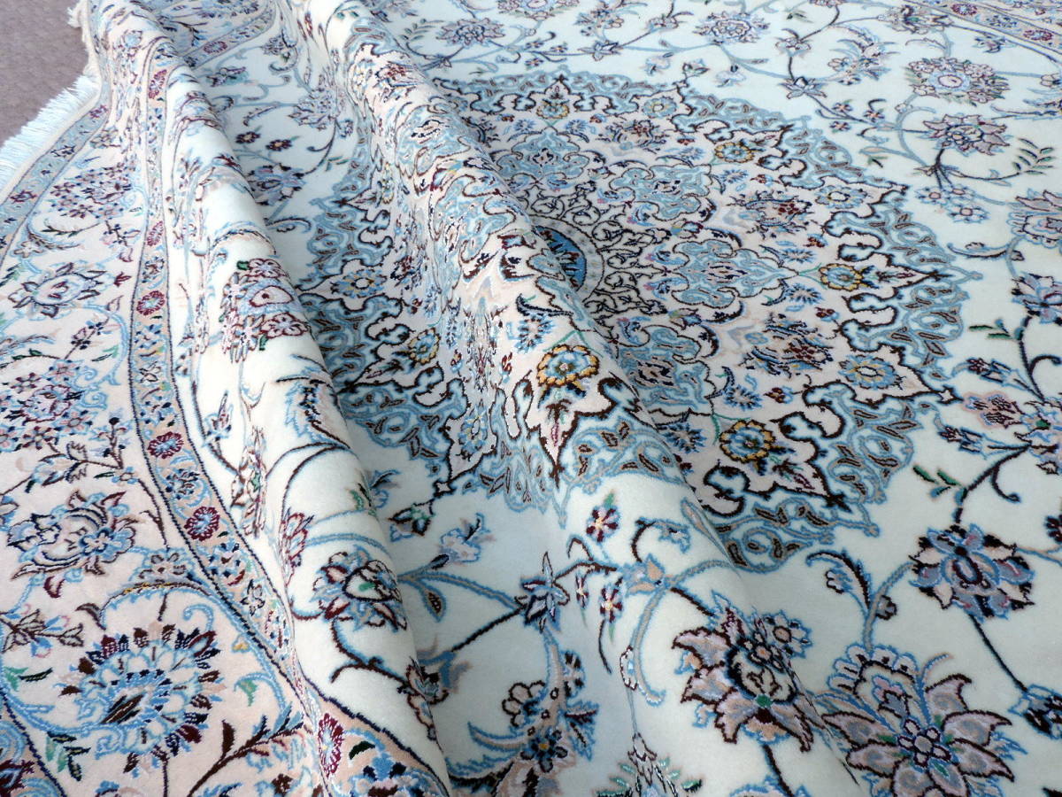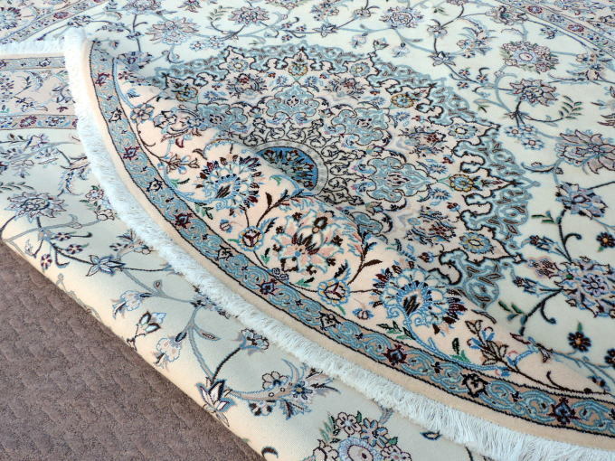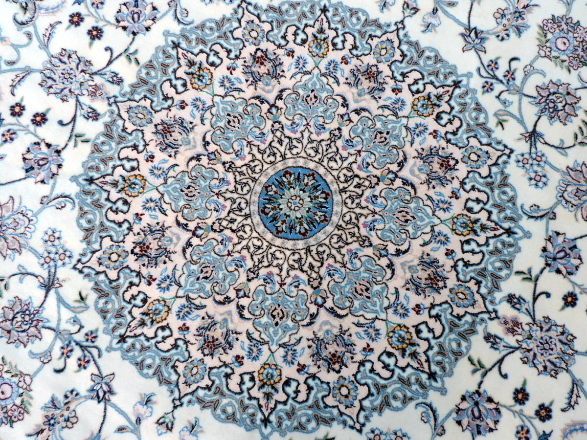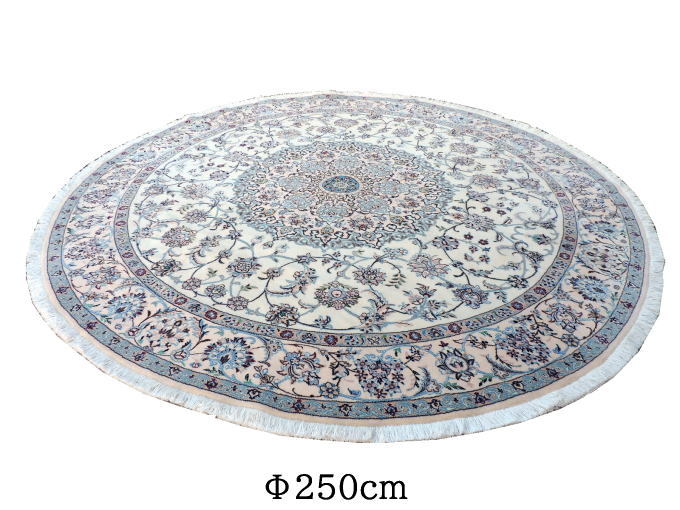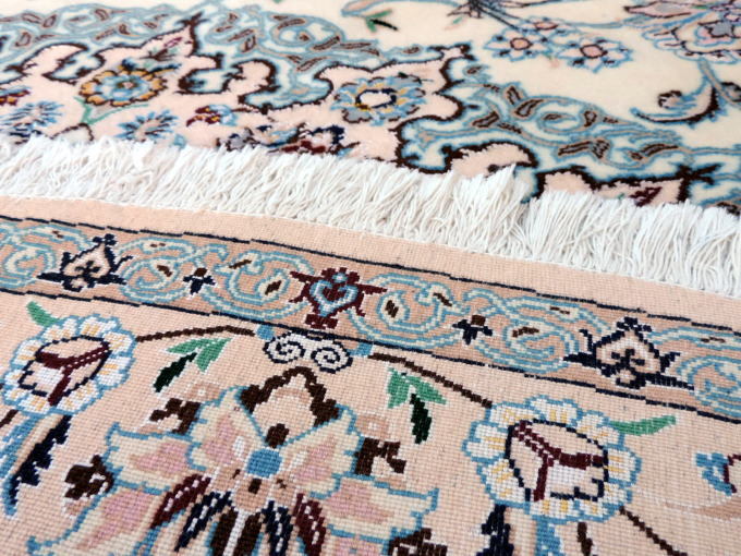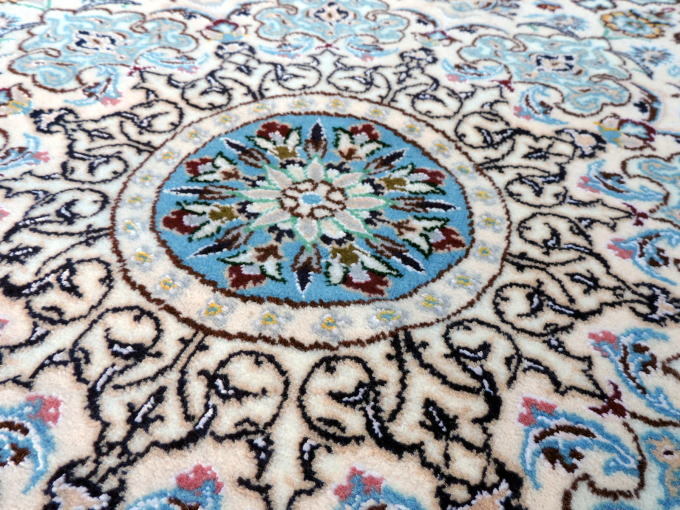 商品について | ナインはイスファハン、クムに並んでペルシャ絨毯の人気産地です。 1930年代から、羊毛をベースに白い絹でモチーフの輪郭をとって紋様を強調させる手法を打ち出し、一躍脚光を浴びています。 色柄も全体的に抑制され、おとなしいのが特徴で“和の心”にも通じるものがあり、邸宅や高級マンションなどにとてもよくマッチします。 |