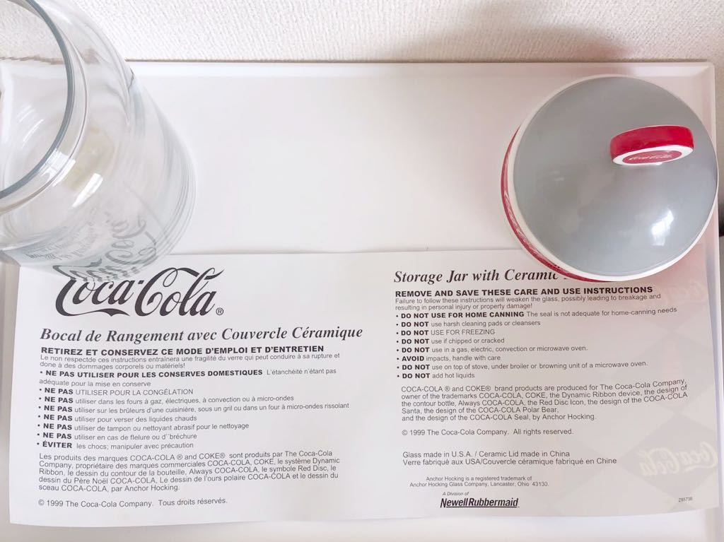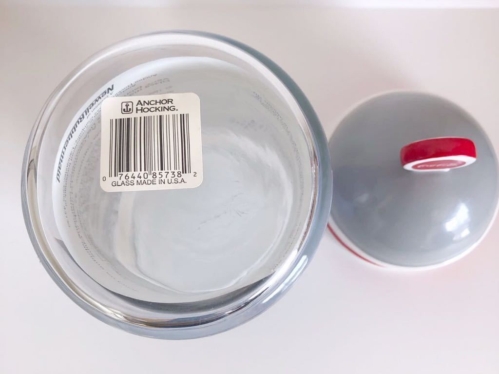 入れ物部分はガラス製、蓋は陶器製です。ガラスの入れ物部分は米国製、蓋は中国製の様です。
