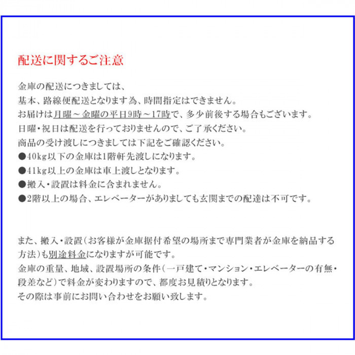 暗証番号間違い表示『Error』、電池切れ表示『Battery』も表示され安心です。万一の暗証番号忘れや電子のトラブルにも、お客様自身で開閉出来る、非常用キー付きです。 【耐火金庫の有効耐用年数は製造後20年】 半永久的に使えると思われがちな耐火金庫ですが、耐火材である気泡コンクリートに含まれる水分が長期使用により気化してしまい、本来の耐火性能を発揮することができなくなります。 日セフ連では、耐火金庫の有効耐用年数の基準を製造後20年として、これを目安に買換えやセキュリティーの見直しをおすすめしています。 【配送に関する注意事項】 ※沖縄・離島・北海道・山口県は別途送料実費となります。 ※40kg以下の金庫のお届けは1階軒先渡しのみとなります。41kg以上の金庫は車上渡しのみとなります。エレベーターがありましても2階以上の配達はできませんのでご了承ください。 ※搬入・設置は別途料金がかかりますので、お問い合わせください。 |