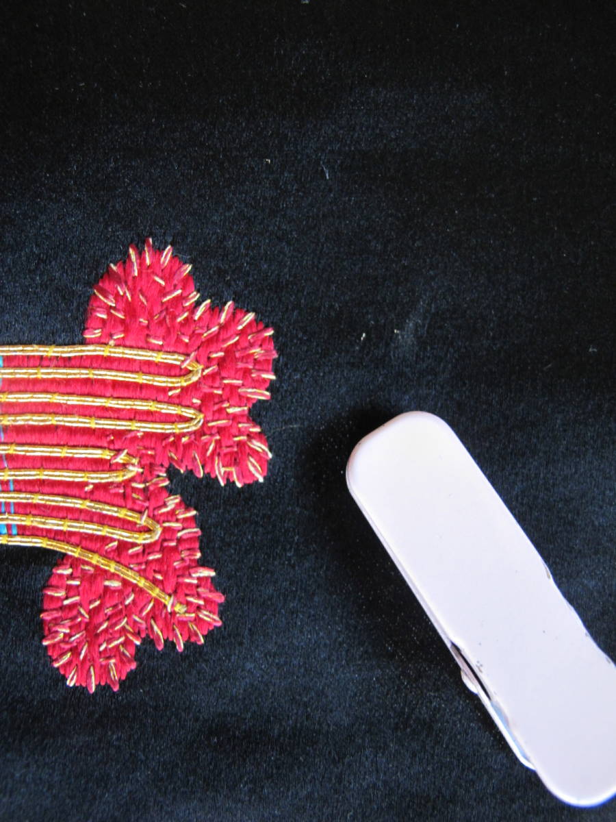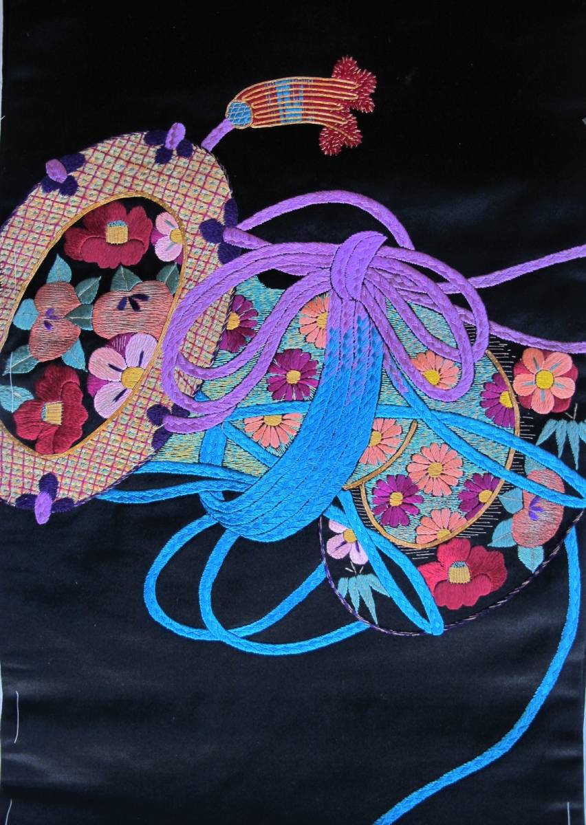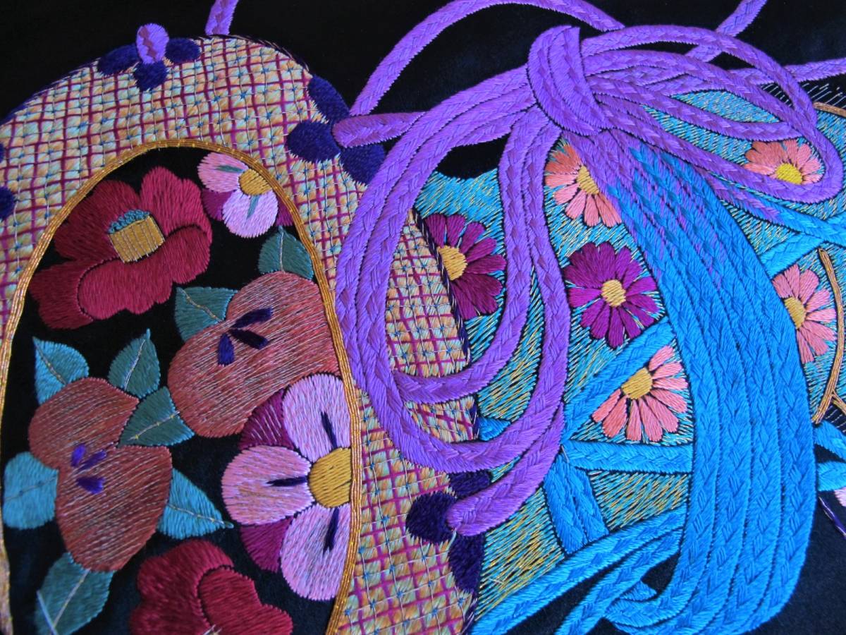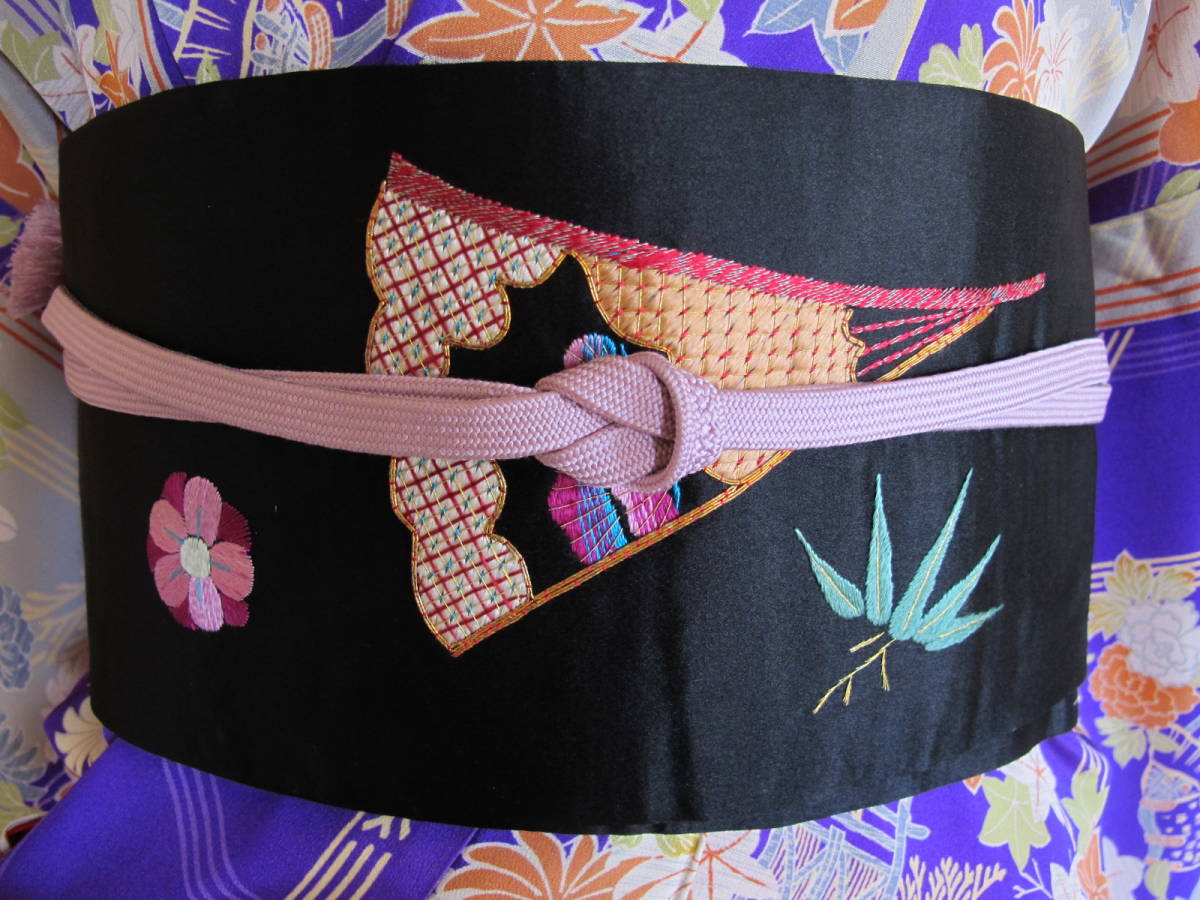 色あざやかな花鼓のアンティーク総刺名古屋帯です。 ターコイズブルーと紫、緑の色合わせが美しいです。 黒繻子地です。 |