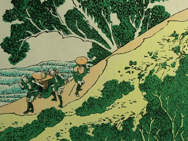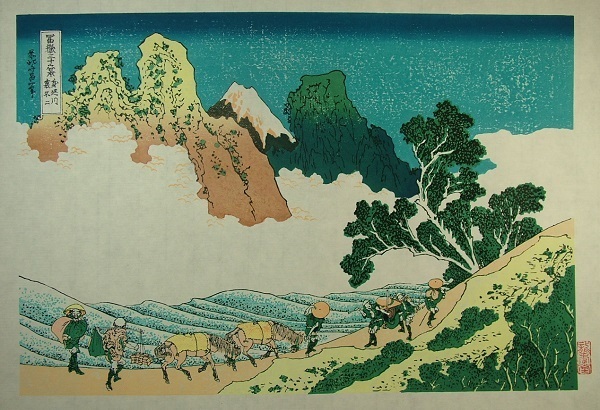 | ●商品説明● | 外寸:440×325mm 絵サイズ:380×258mm 技法(種別):木版画 紙質:和紙 ●世界的芸術家、葛飾北斎。その『富嶽三十六景』中の『身延川裏不二』です。龍香堂と親交の有る版画研究室から買い取りました。北斎の描いた富士の自然な美を、手摺木版で忠実に復刻した作品です。 ◎当品は和紙1枚の状態です。額飾しておりません。 ※画像3は版木の一部と裏面の画像です。版画用染料が裏写りしているのは、印刷ではないことの証しです。 ●「富嶽三十六景」四十六枚は、古来日本人のすべてに愛され親しまれてきた。富士山を中心に、自然界の風景を幾何学的要素に還元して見る手法を縦横に駆使し、清新な色調で組絵の面白さを求めた傑作で、北斎五十年間の画業は、まさに此処に凝縮されていたと言えます。更に、西洋から輸入された人工顔料ベルリアン・ブルーを用い、従来の藍よりも一際鮮やかな発色が評判になり大流行を呼びました。 【作品解説】「身延川裏不二」(みのぶがわうらふじ): 身延山には日蓮宗の大本山久遠寺が有る。当時のそこへの参詣道は単純な道中ではなかったのであろう。波うつ急流の川、湧き上がる霧、荒々しい姿の岩山、その間から鋭い傾斜の富士が見える。北斎にしては珍しく厳しい臨場感を持った表現であるが手前の旅人や馬、駕籠など人の営みを巧みに配置する事により、旅の厳しさと絶景とのバランスが見事に保たれた作品になっている。 |