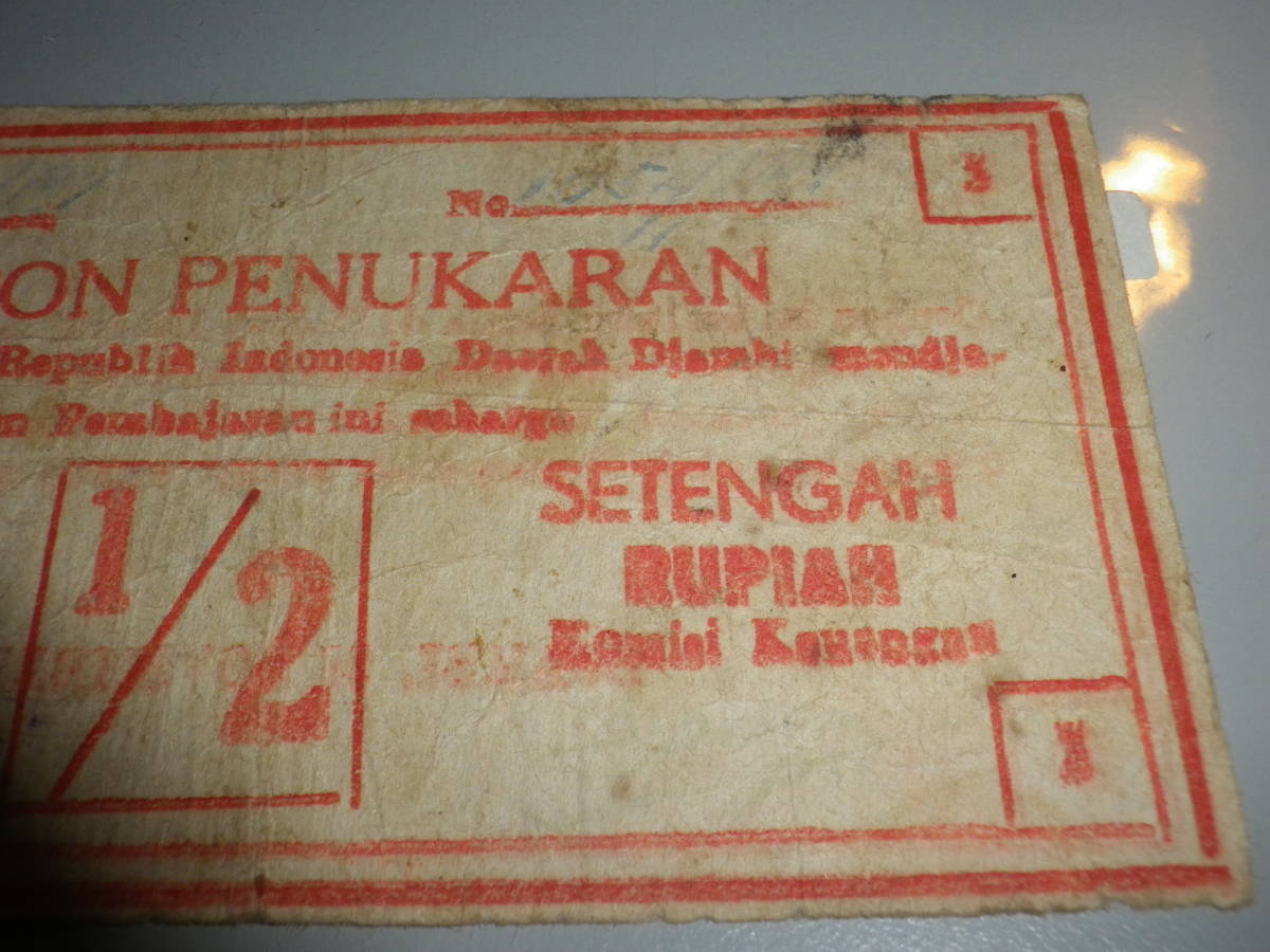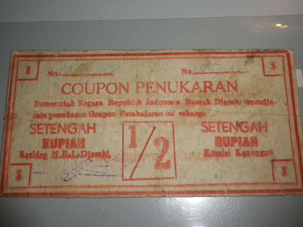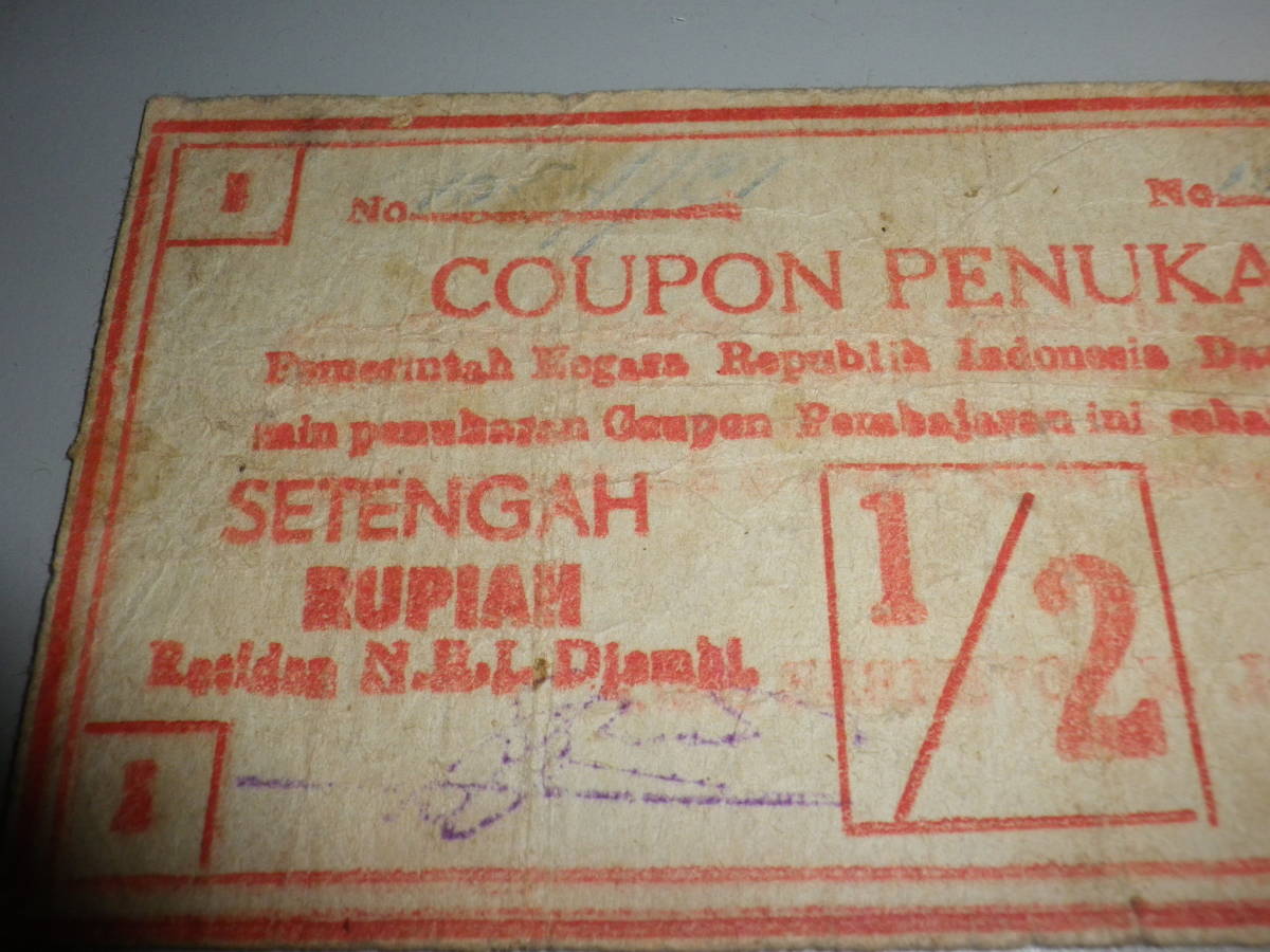 インドネシア 1947年 戦時代用貨幣(COUPON)2分の1 Rupiah 並品