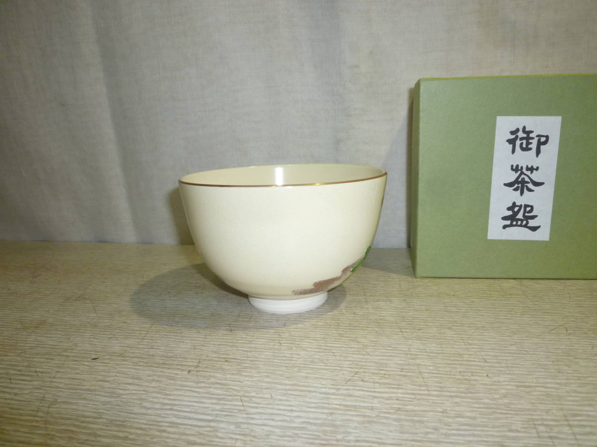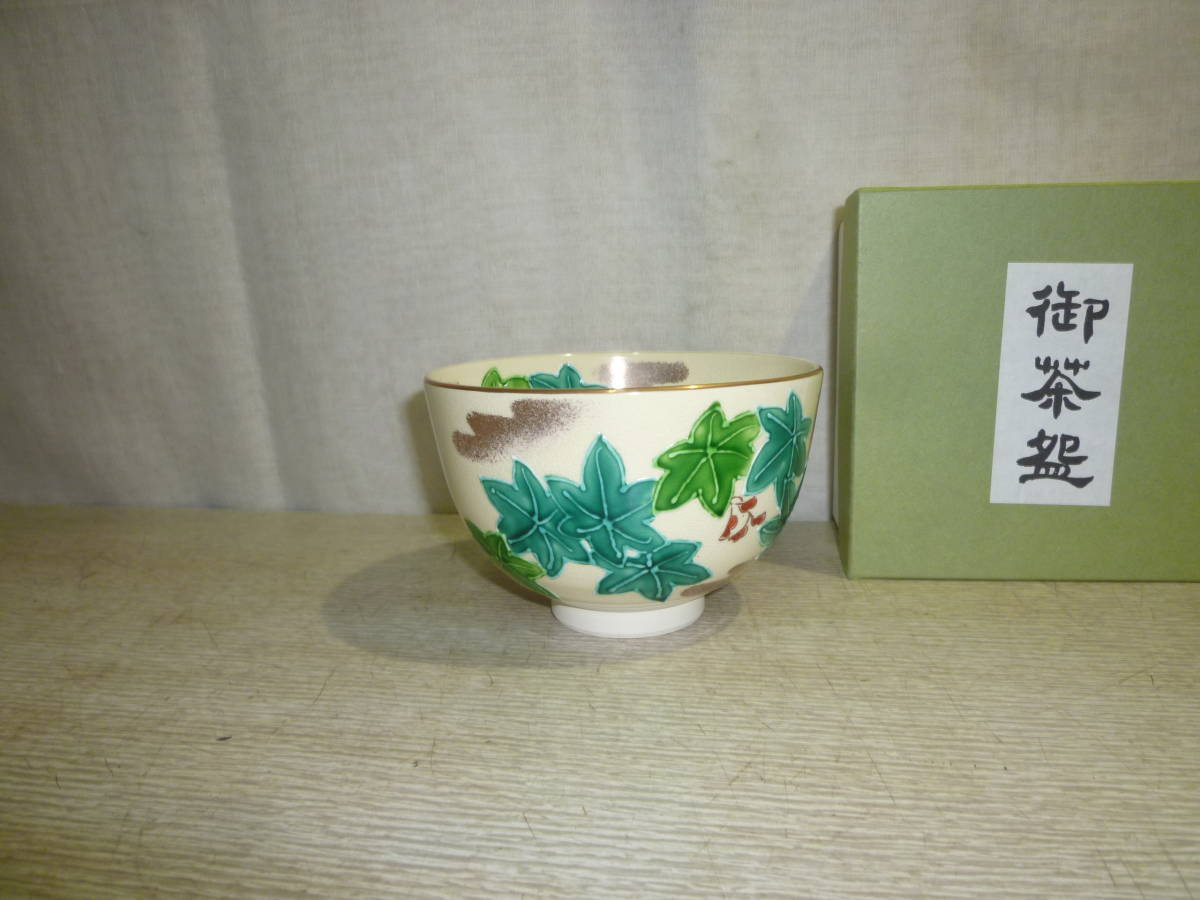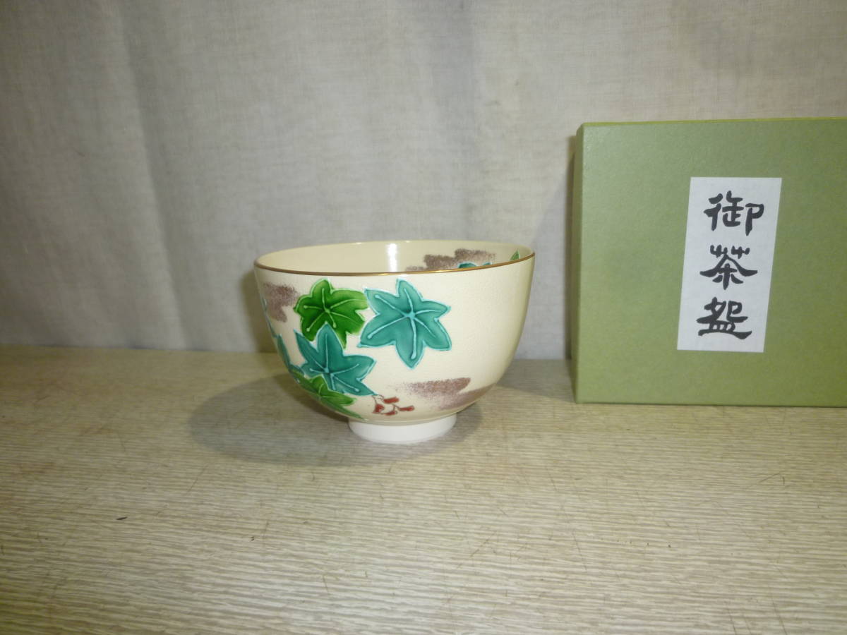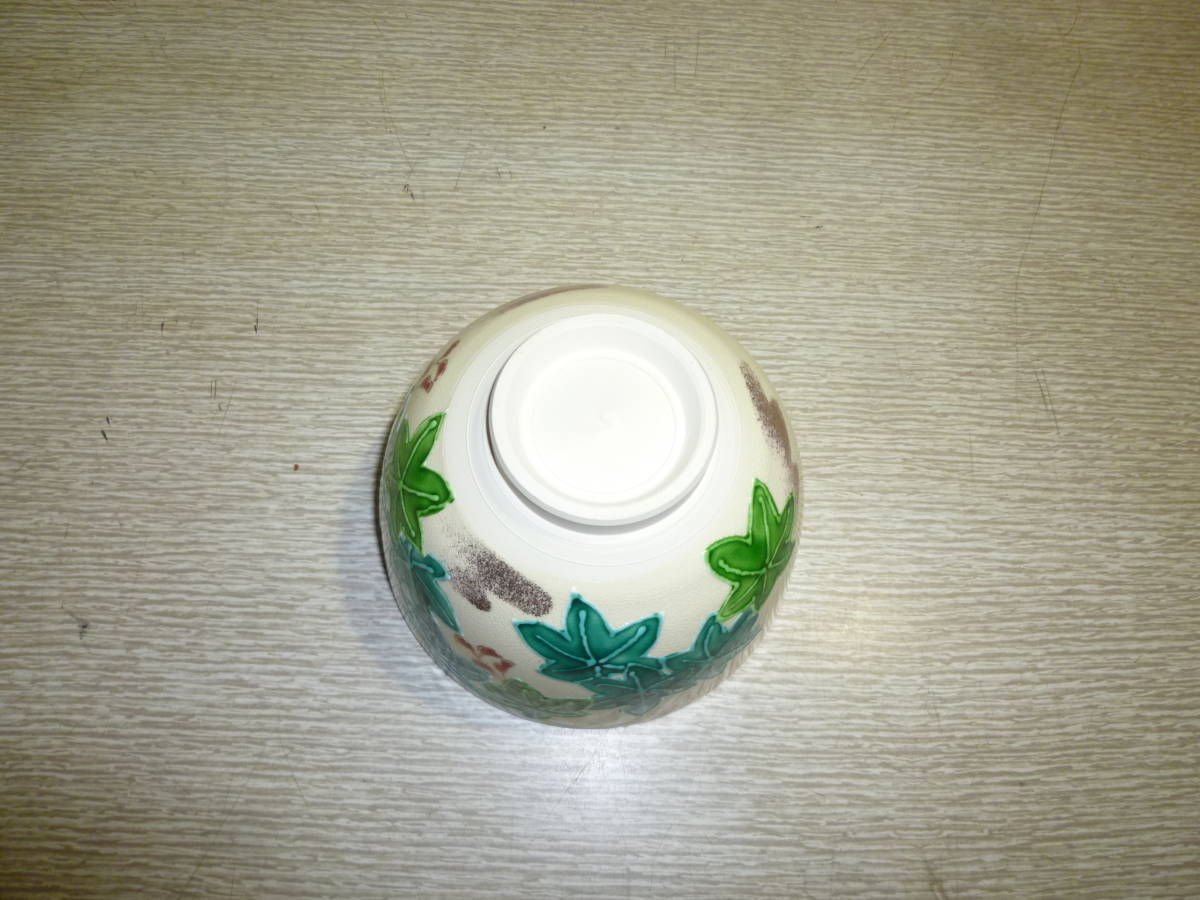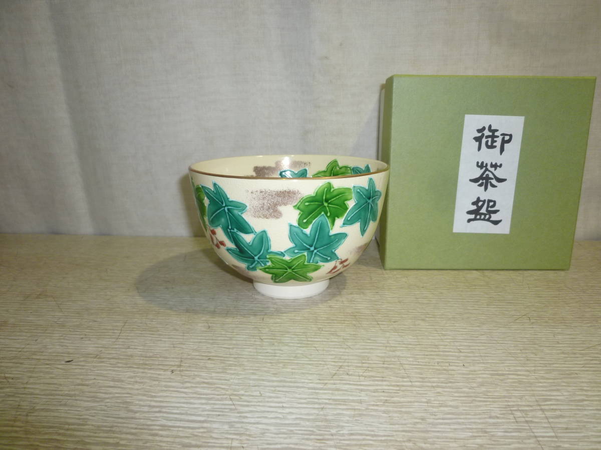 「未使用・茶道具」 瀬戸陶工の加藤隆山さんのイッチン技法の仁清写の茶碗です。 青楓の図です。 径約12.2cm 高さ約7.9cm 高台の横に印有。 化粧箱。 在庫品ですので、どうぞ宜しく。