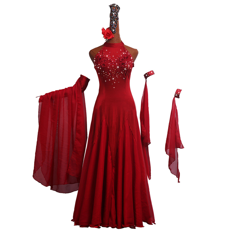 新品 レディース社交ダンス衣装 モダン競技ドレス セット品  S~2XL選択可 モダンドレス 赤色 フロート付き