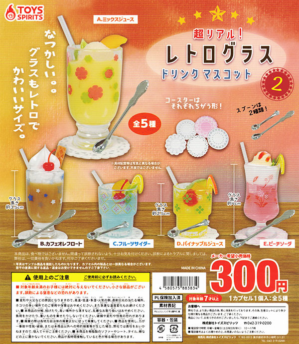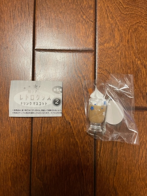 トイススピリッツから発売の超リアル レトログラスドリンクマスコット2、全5種のうち『カフェオレフロート』です。スイーツ固有の特徴が見事にデフォルメされ造形されています。内袋未開封(このシリーズの内袋はもともと完全密封ではありませんが、セロテープを貼って止めてあります)、リスト付きです。