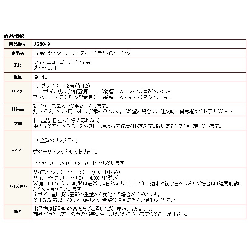 商品名 | 18金 ダイヤ 0.13ct スネークデザイン リング |