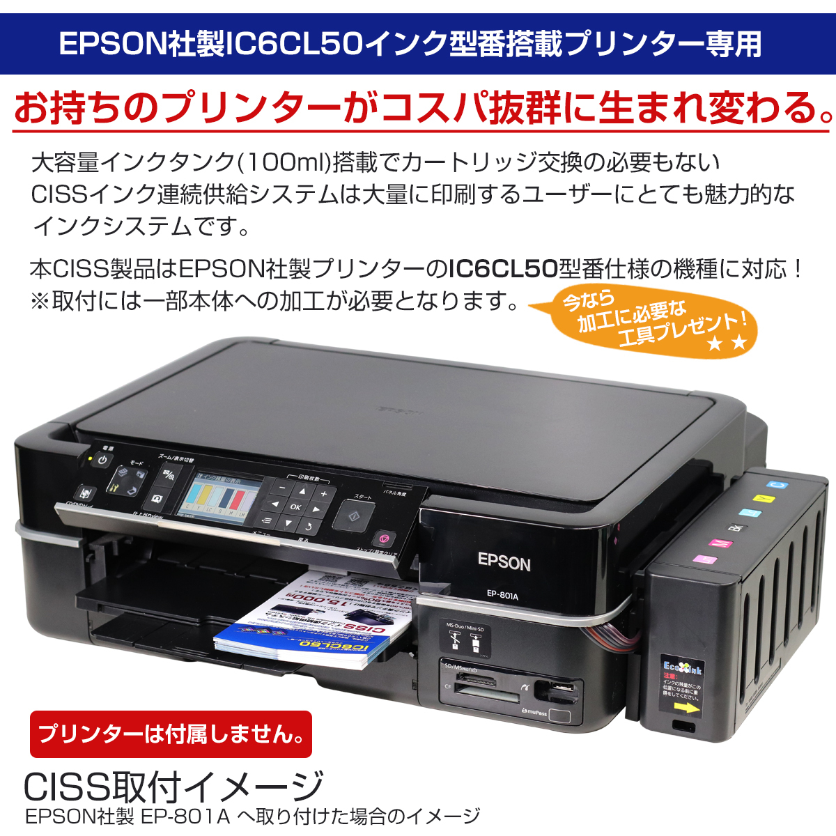 本CISSシステムはEPSON社製プリンターのIC6CL50型のインクカートリッジを使用している機種に対応。