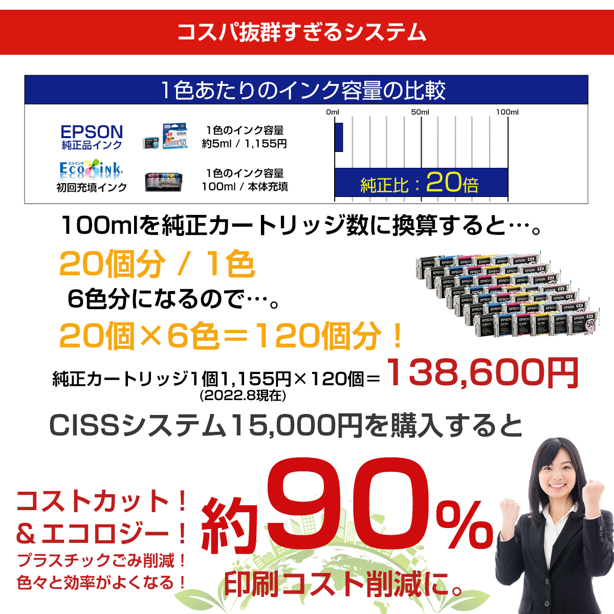 大容量インクタンク(100ml)搭載でカートリッジ交換の必要もなくCISSインク連続供給システムは