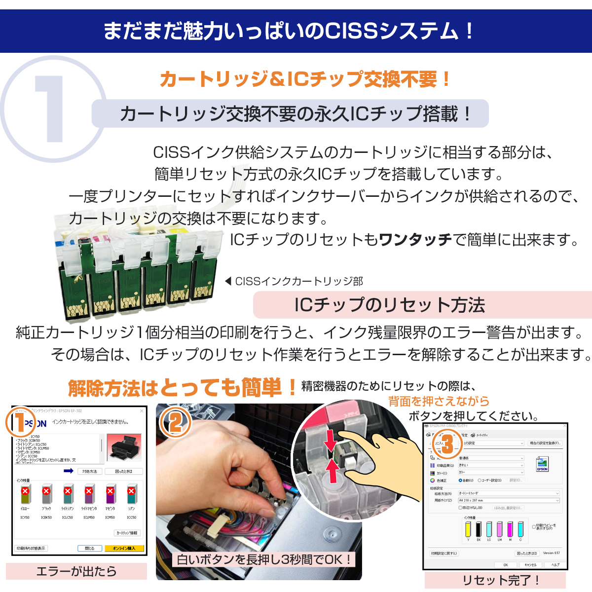 大容量インクタンク搭載でカートリッジ交換の必要もないCISSインク連続供給システムは大量に印刷するユーザーに魅力的で印刷コスト削減できるインクシステムです。