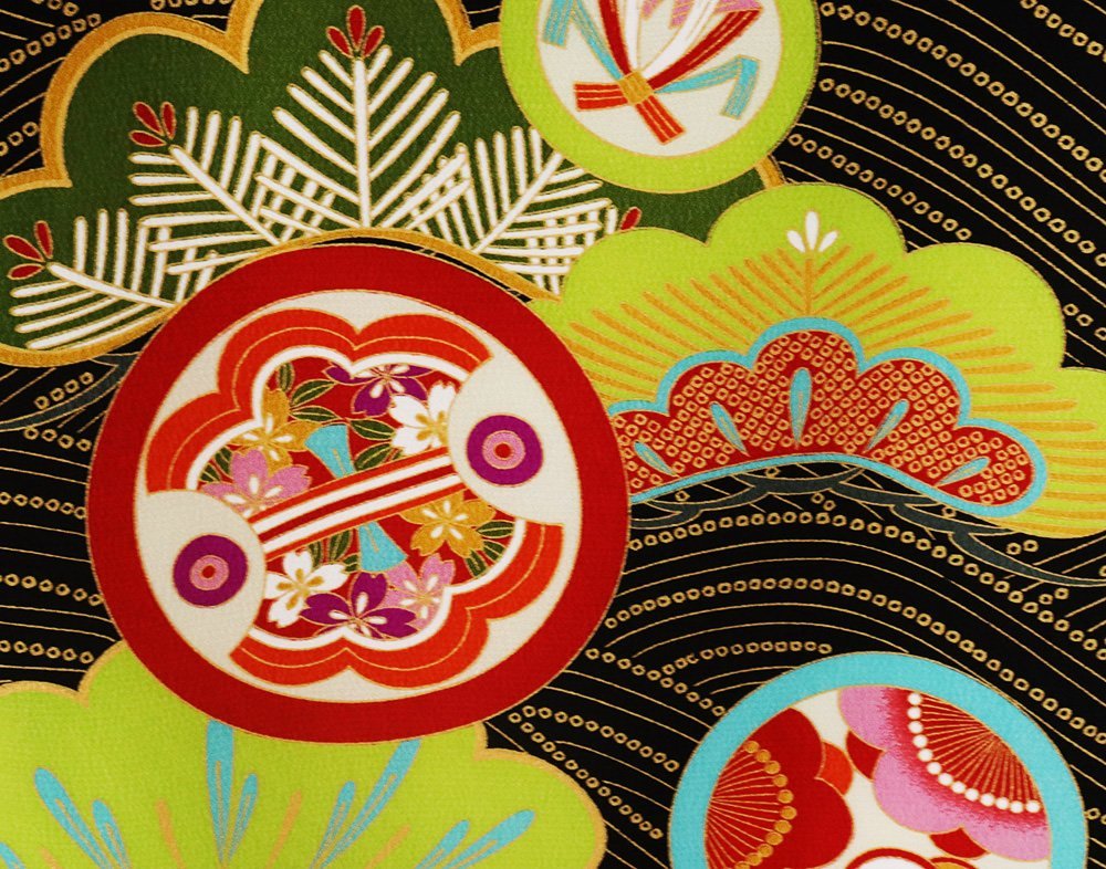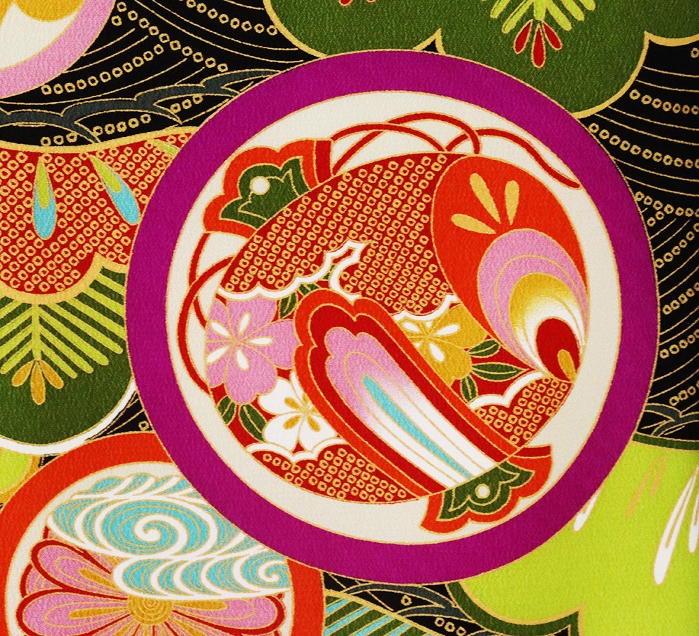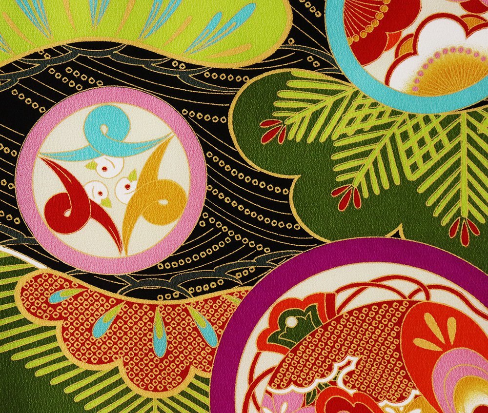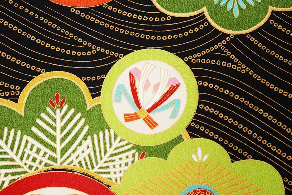 色・柄 | レトロ調 振袖 袷 黒・緑地 宝尽くし・三つ梅・三つ雁・丸文・松・波 (写真では上手く色が出ない場合があります。ご了承下さい) 写真の枚数が多いので一度パソコンでご覧ください。 |