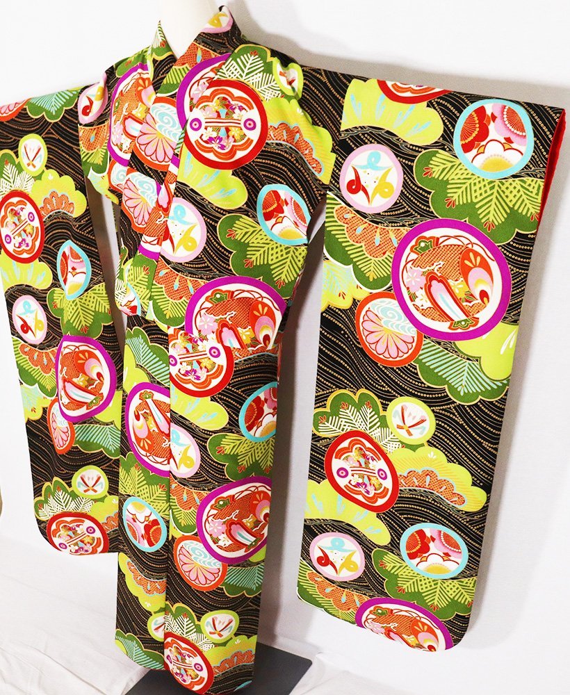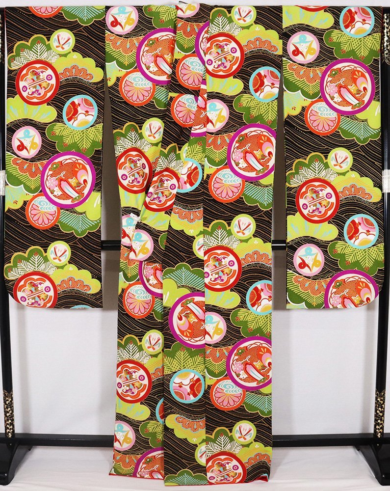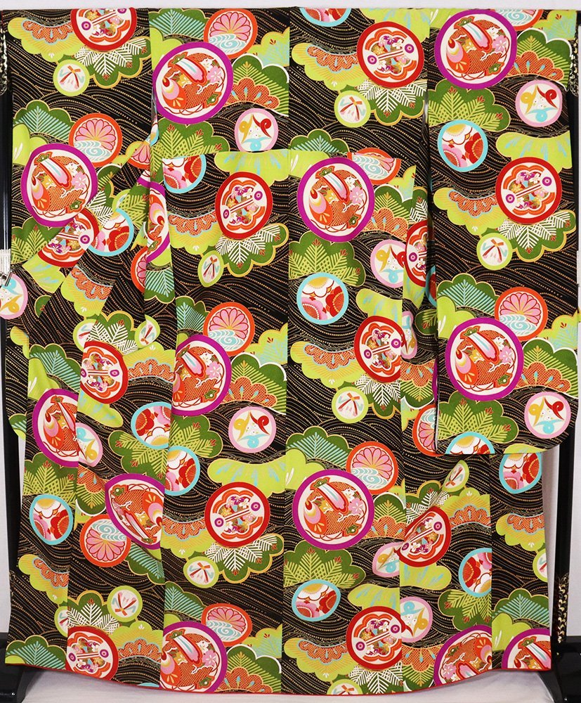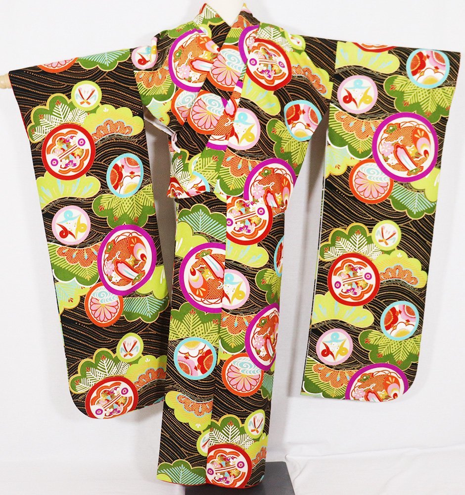 レトロ調 振袖 袷 黒・緑地 宝尽くし・三つ梅・三つ雁・丸文・松・波 176 広襟 | |