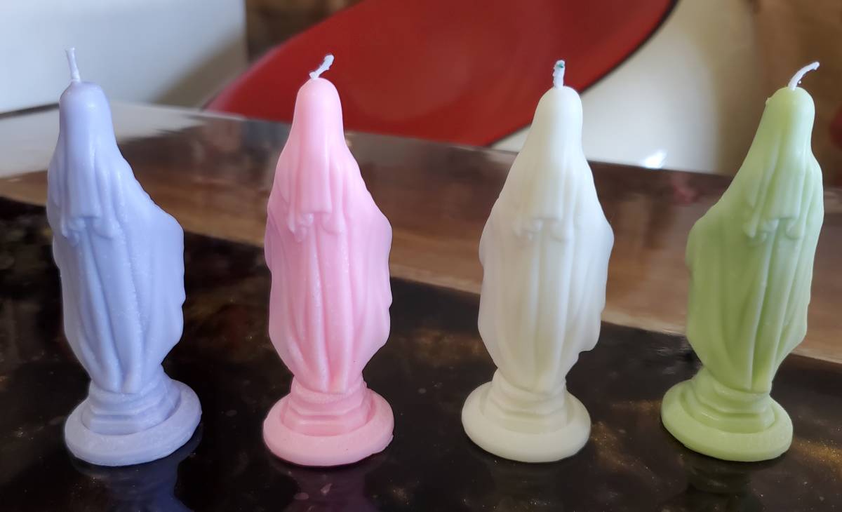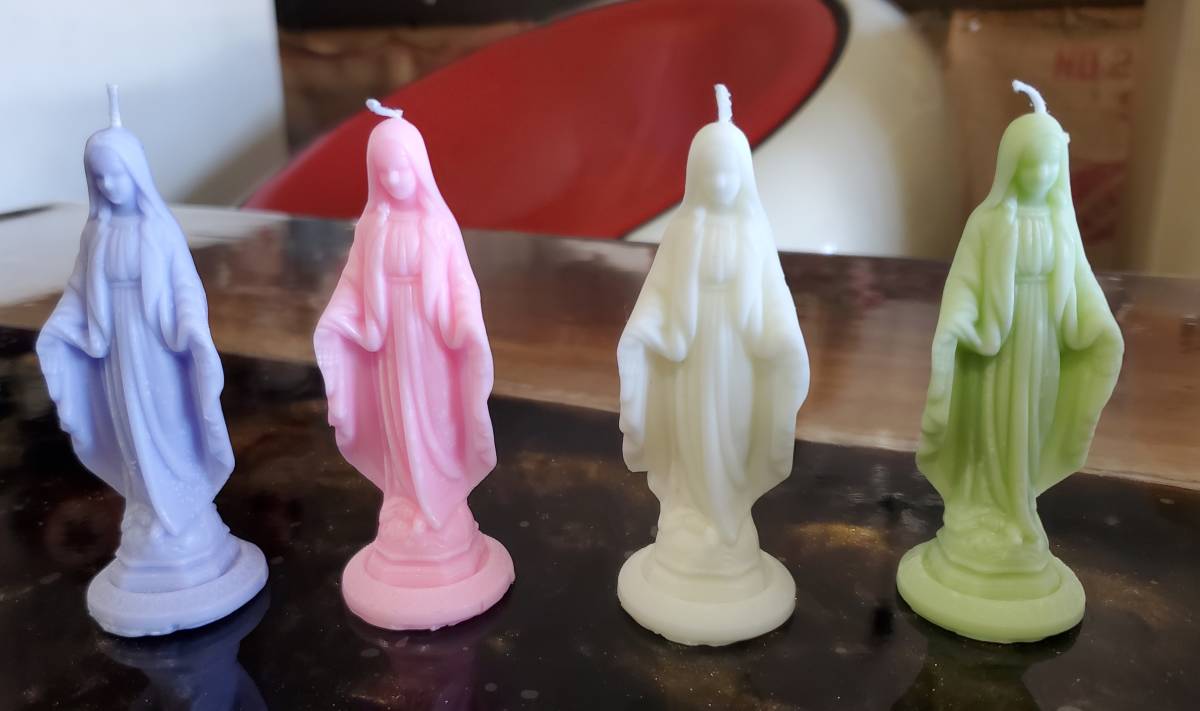 マリア像のキャンドル4体セットです。約9センチあります。バラ売りはいたしません。ノークレームでお願い致します。発送はヤマトの着払いです。