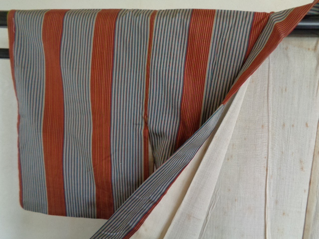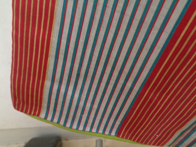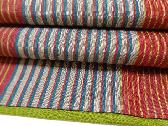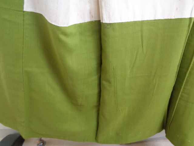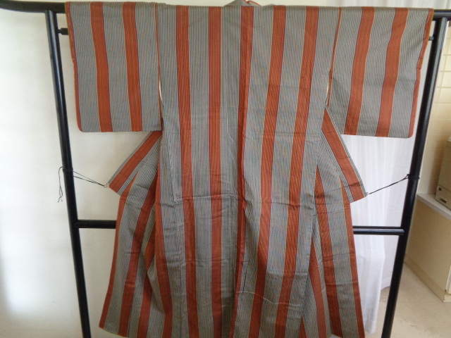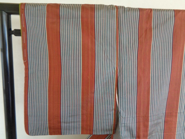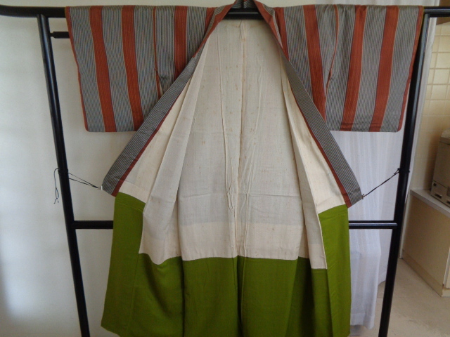 C274-80 正絹 縞文 着物 八掛 草緑色 昭和レトロ アンティーク