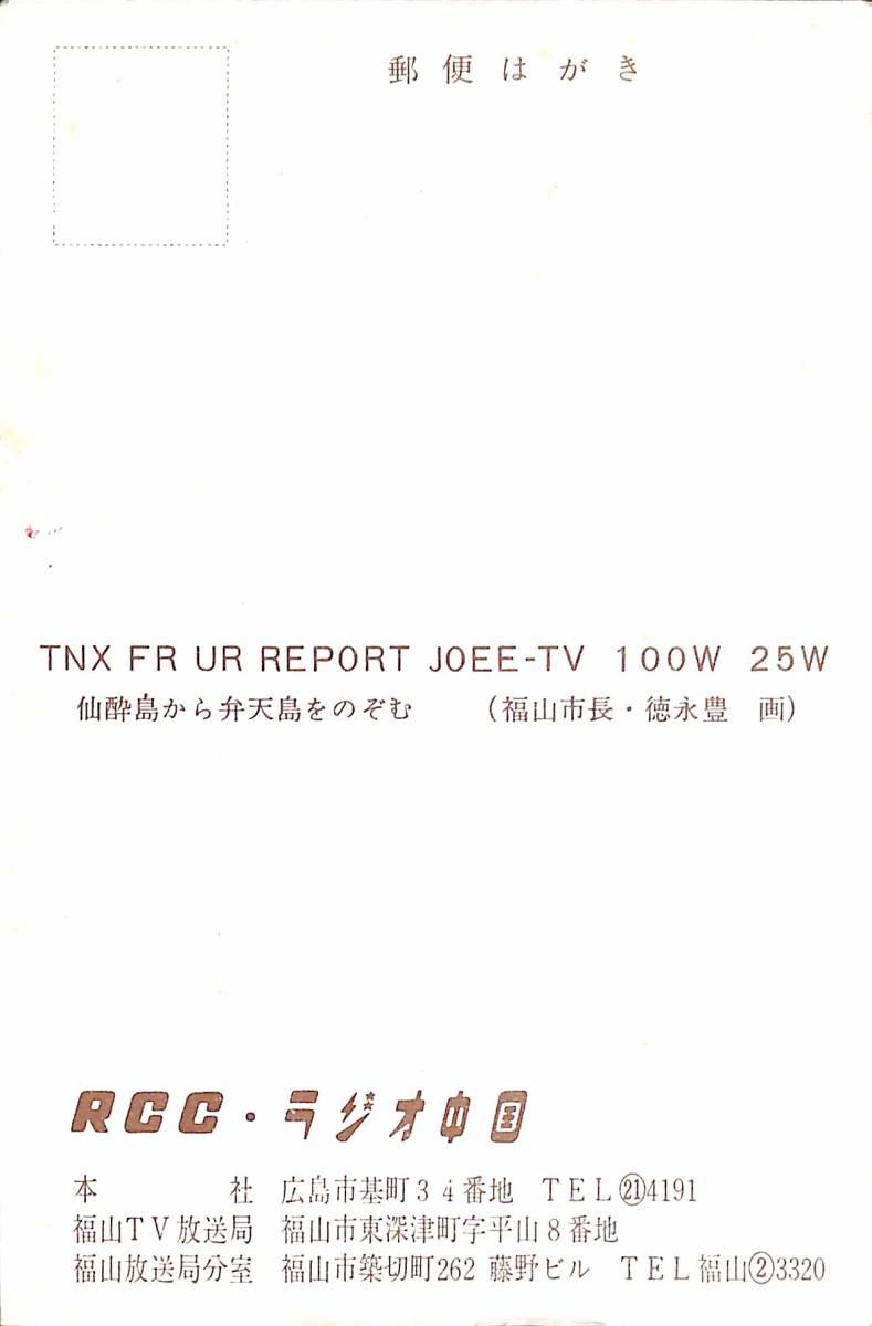 | 【商品名】・・・JOEE-TV(★ラジオ中国福山TV放送局★現RCC中国放送)のテレビ用ベリカード。 【コメント】・・・昭和30年代~40年代のベリカードは大変貴重です! 【国名・地名】・・・日本★広島県。 【受信データ】・・・1950年代(★昭和30年代)・VHF7CHを受信。 【記載事項】・・・未記入。 【状態】・・・シワ、汚れ、シミ、焼け、色あせ等があります。 ■カードの状態は★画像を参考に判断して下さい。 ■この機会にぜひこのベリカードを貴方のBCLコレクションに加えて下さい! | |