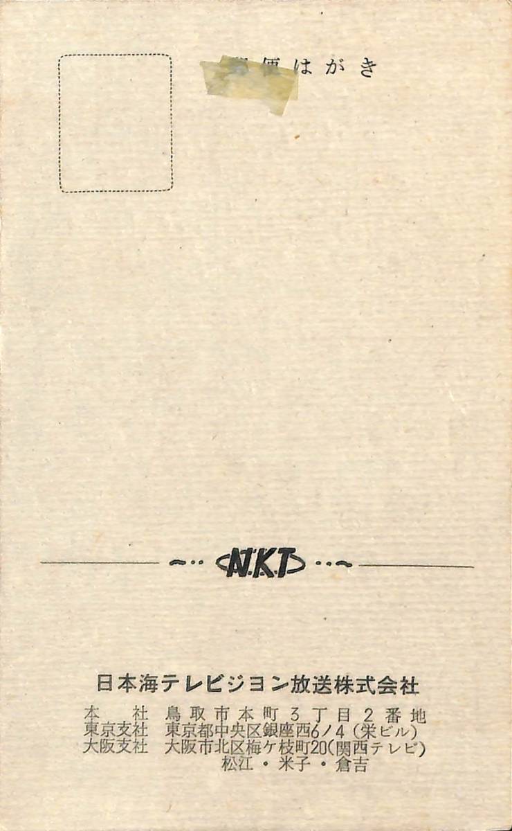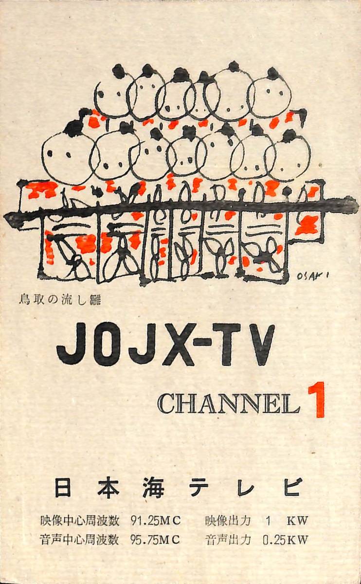 | 【商品名】・・・JOJX-TV(★NKT・日本海テレビ)のベリカード。 【コメント】・・・昭和30年代~40年代のベリカードは大変貴重です! 【国名・地名】・・・日本★鳥取県。 【受信データ】・・・1950年代(★昭和30年代後半)・VHF1CHを受信。 【記載事項】・・・未記入。 【状態】・・・シワ、汚れ、シミ、焼け、色あせ等があります。 ■カードの状態は★画像を参考に判断して下さい。 ■この機会にぜひこのベリカードを貴方のBCLコレクションに加えて下さい! | |