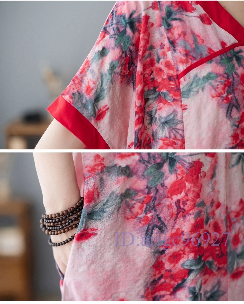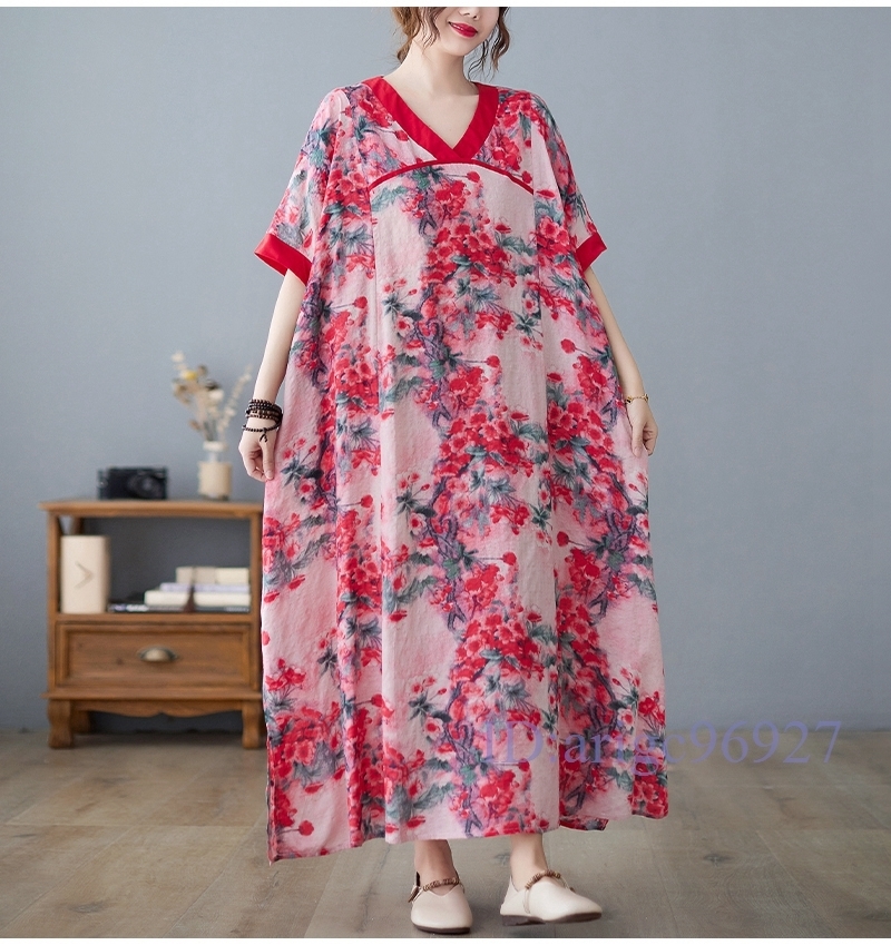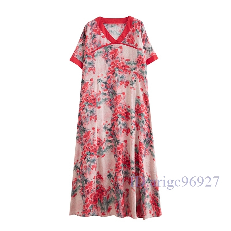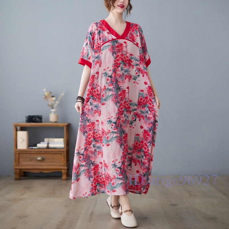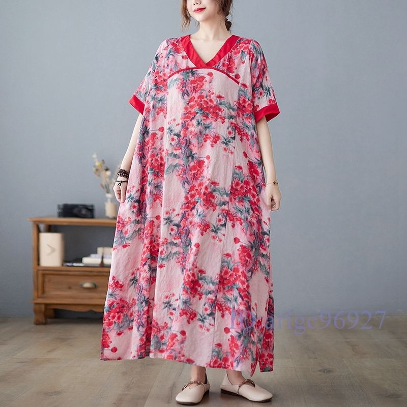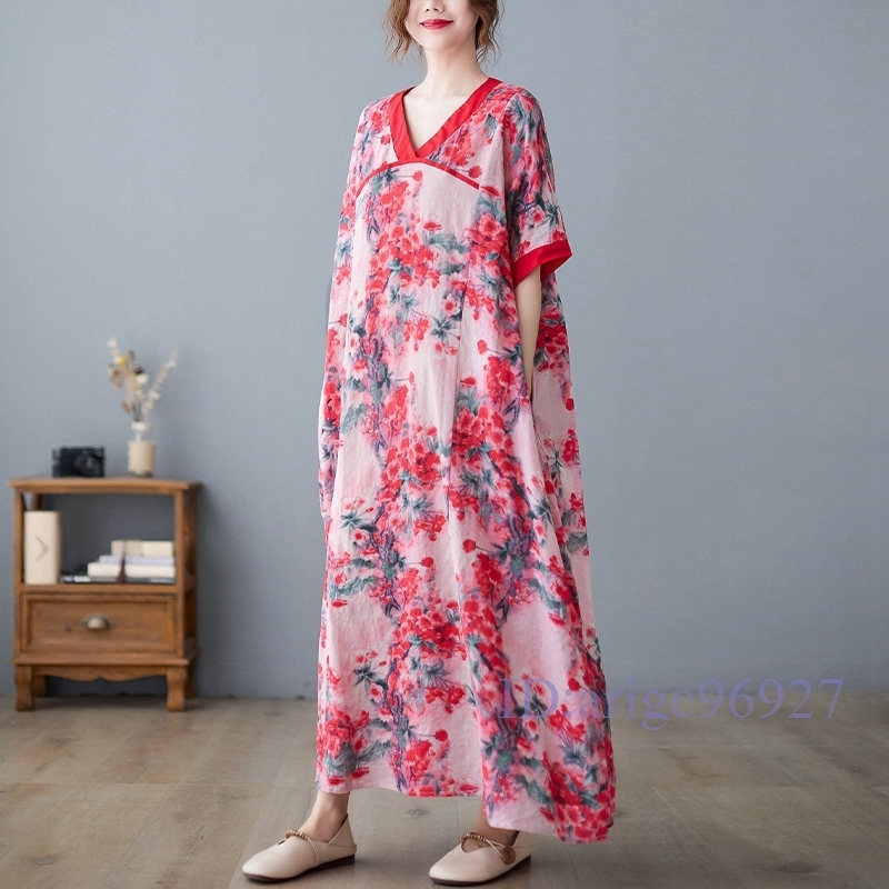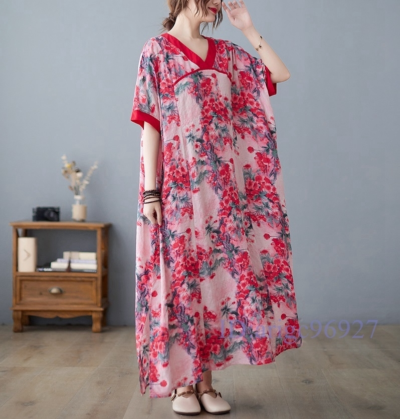 N326★新品夏*レディース*カジュアル*ゆったり大きいサイズ体型カバー*総柄花柄*Vネック半袖マキシロングワンピース*レッド
