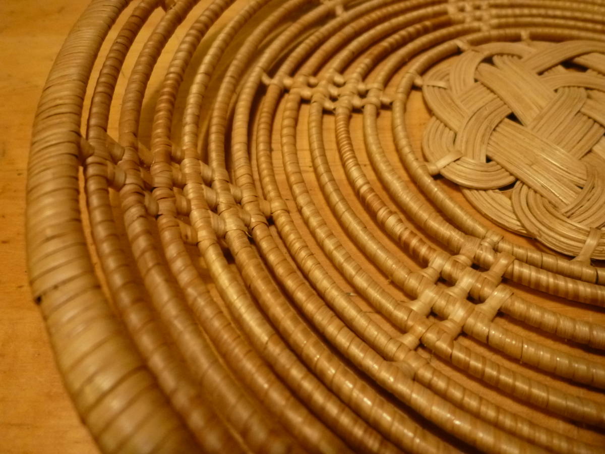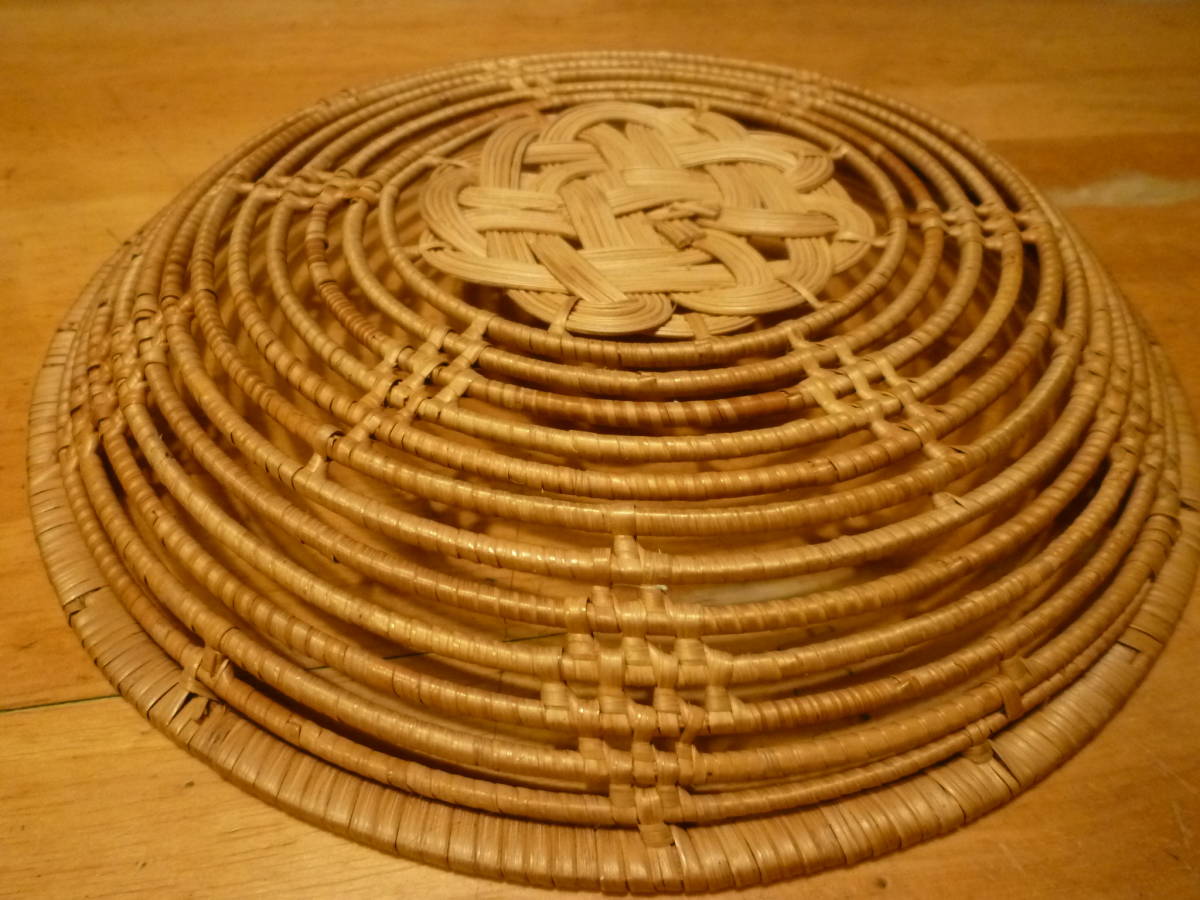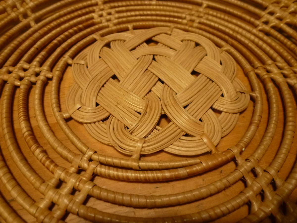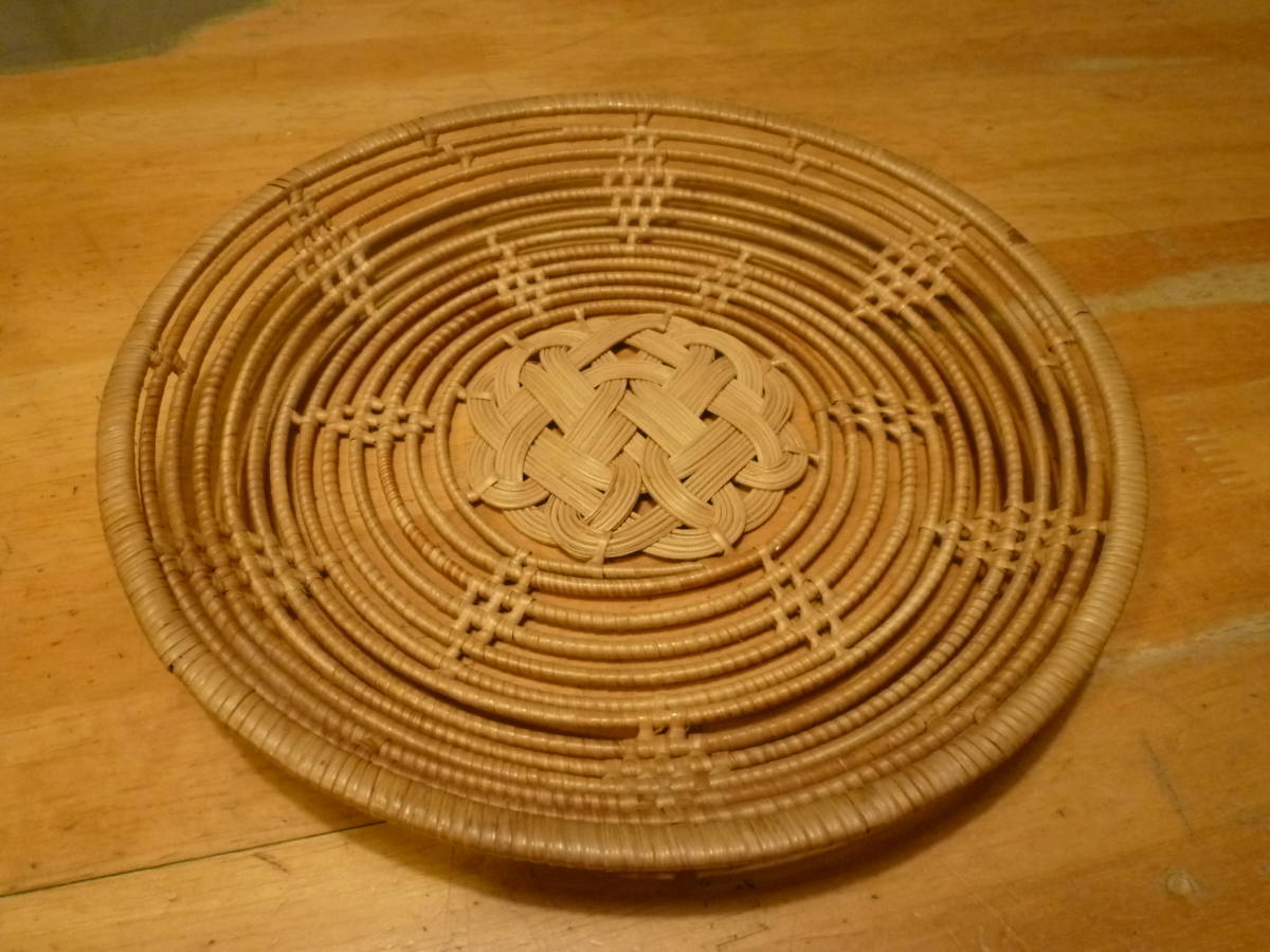 こちらは水引材等の様なもので編んだ果物入れ?の様ですが、その内容等ははっきりしません。表面を同材で巻いた棒状のものを、組み上げた中心部フチ周りからクルクルと立ち上げ、それぞれの箇所で隙間が均等になる様に支え箇所も綺麗に組んだデザインで収めてあるもので、全体はかなりしっかりしていると思います。