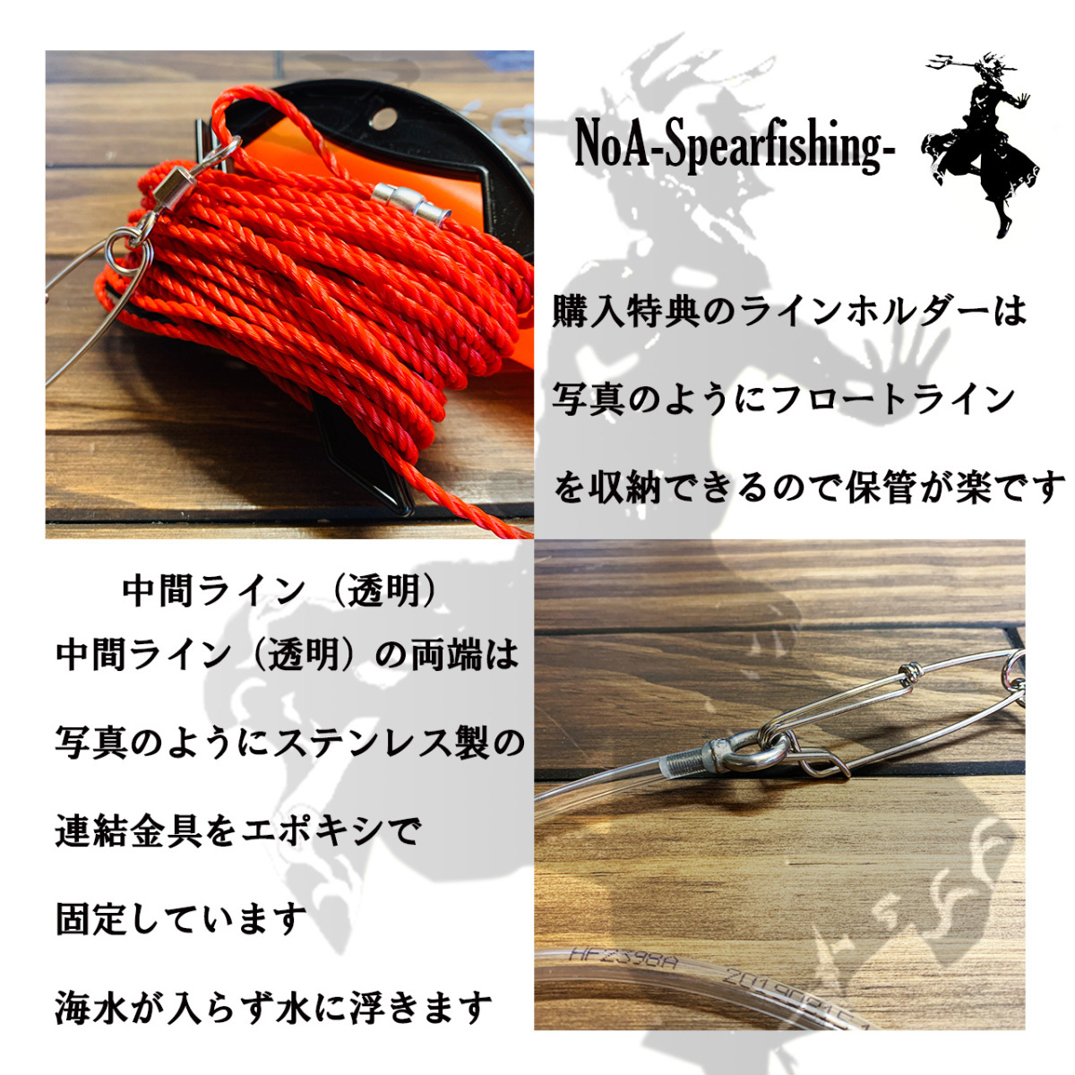 | 特徴 | ★フロートシステムは安全性と利便性を兼ね備えた必須アイテム ・中間フロートを海中に引き込んだ状態で放銛可能 ・中間ラインに浮力を持たせることにより、銛や体への絡まりを激減 ※購入特典 ラインホルダー ・フロートライン収納用でお使いください |