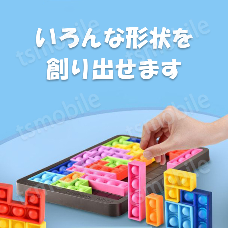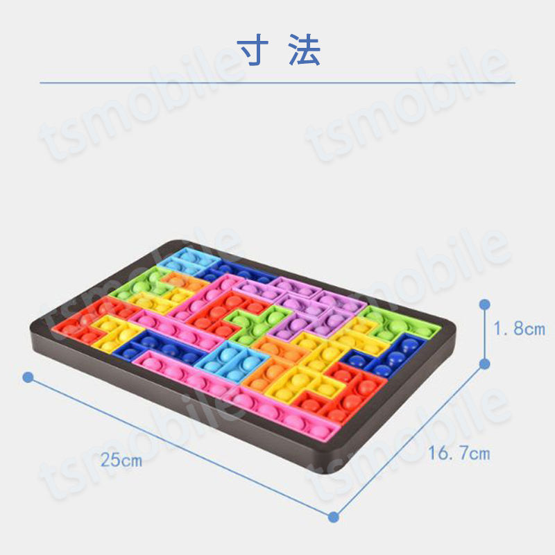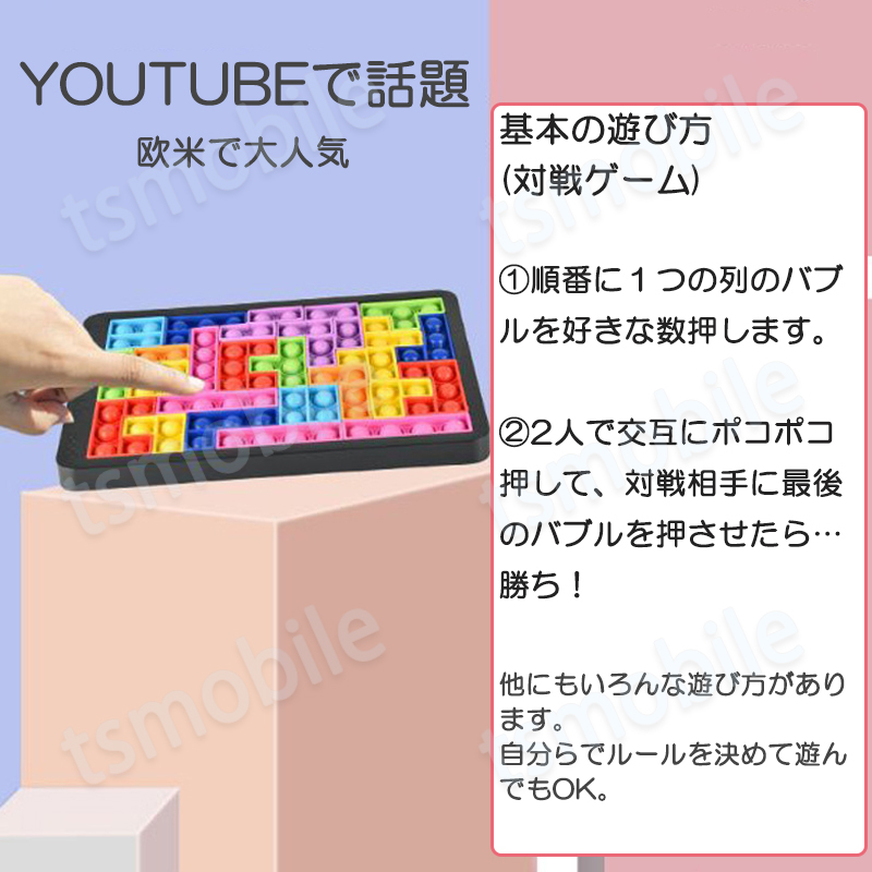 | 男の子も女の子もレインボーカラーで楽しい。youtube等のSNSで話題になっている、欧米で大人気なおもちゃです。クリスマスプレゼントや誕生日プレゼントに最適です。空間想像力を育つ、脳トレ、考え力を身につける、手指の感覚トレ、色の認知に役に立つゲームです!子供の大好きなカラフルスタイルです。テトリスブロックとしても、プッシュポップとしても遊べる。誕生日、クリスマス、入学祝い、進級祝い、ご褒美の贈り物にも。年齢に合わせていろんな使い方ができる!長く遊べる楽しいおもちゃです。ブロックが柔らかいので怪我の心配は要りません。軽い、薄い、持ち運びラクラク。手入れ簡単 水で洗える。基本の遊び方(対戦ゲーム)(1)順番に1つの列のバブルを好きな数押します。(2)2人で交互にポコポコ押して、対戦相手に最後のバブルを押させたら…勝ち!他にもいろんな遊び方があります。自分らでルールを決めて遊んでもOK。 |