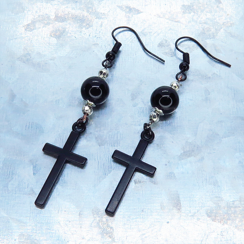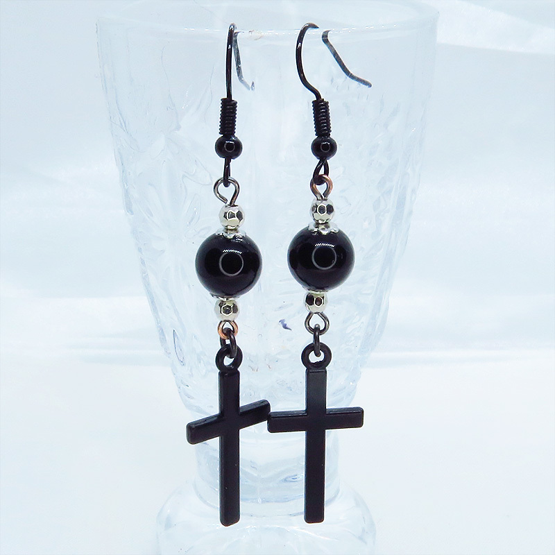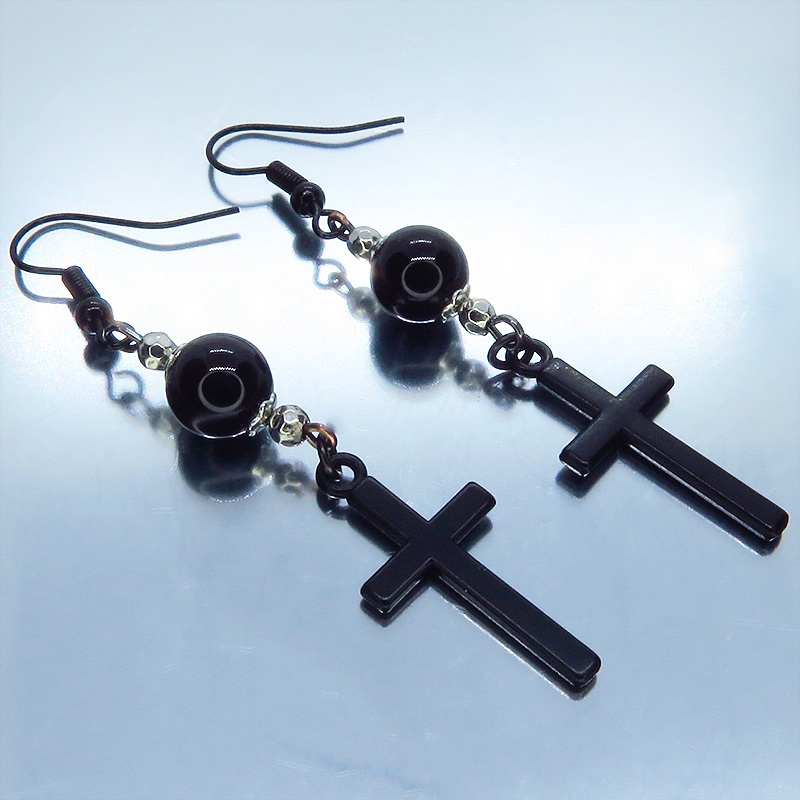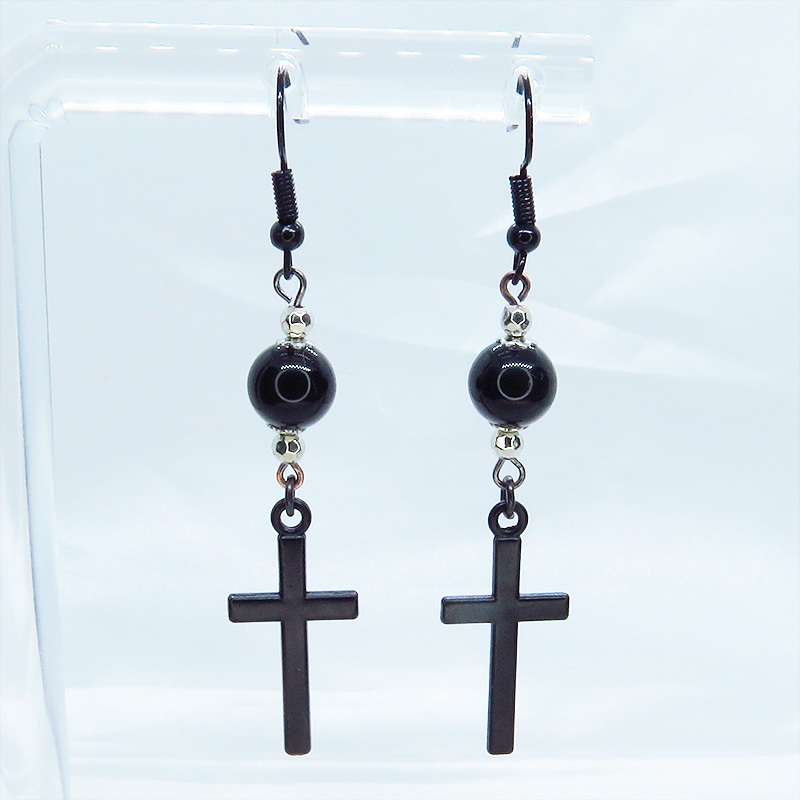 黒のロザリオ(十字架)と黒く輝く大きめのオニキスを組合せたシンプルでスマートなブラックピアスです