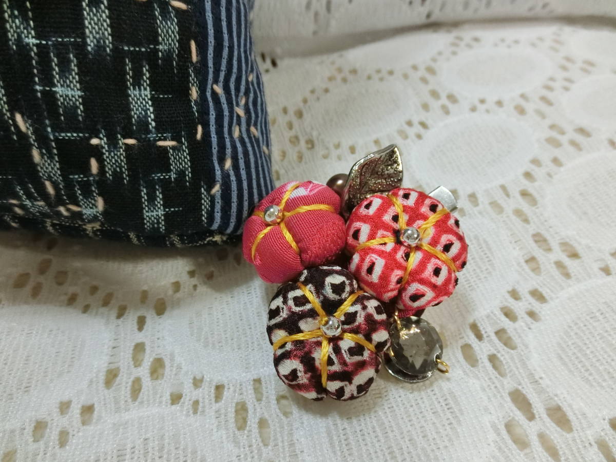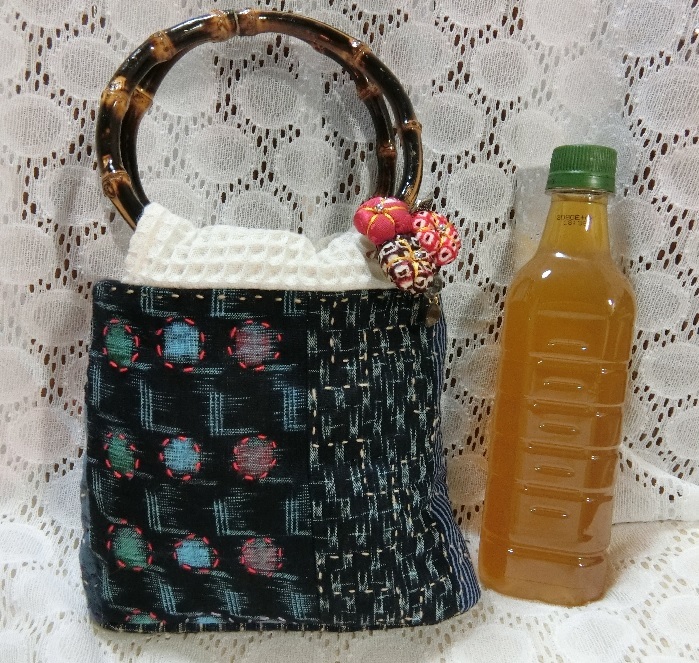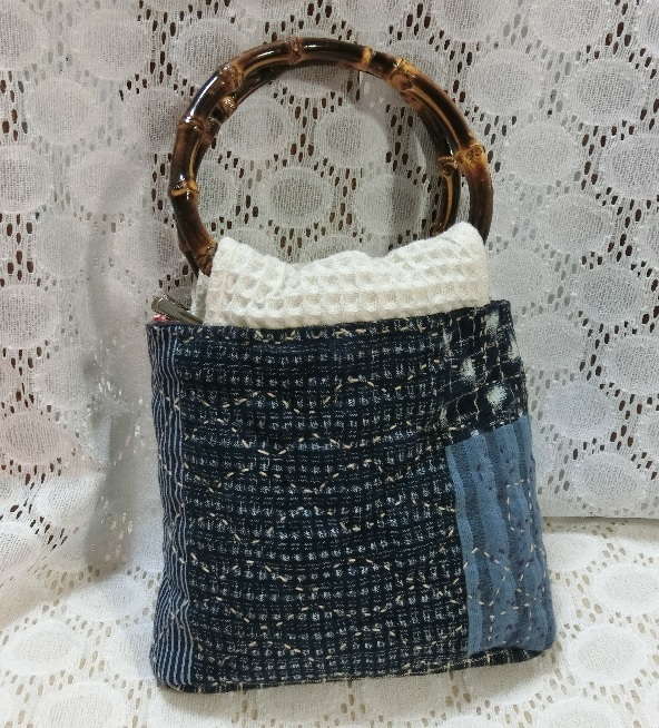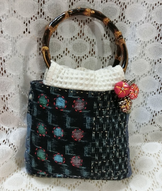 送料無料!バンブーハンドルミニバッグ 藍木綿 パッチワーク 刺し子入り ブローチ付 ハンドメイド いつうさ【36w】
