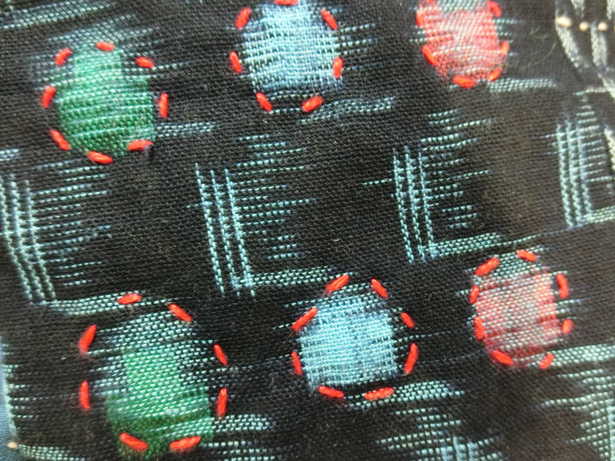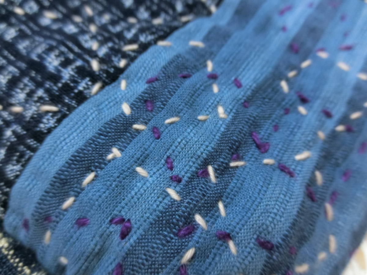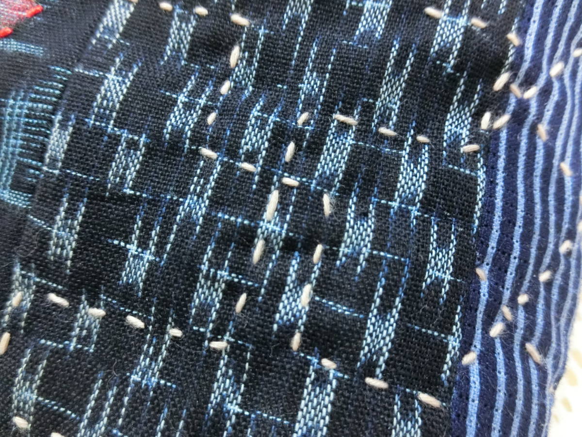 古布の藍木綿の生地をパッチワークして、ランダムに刺し子を入れました。