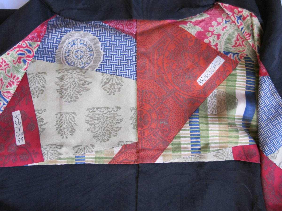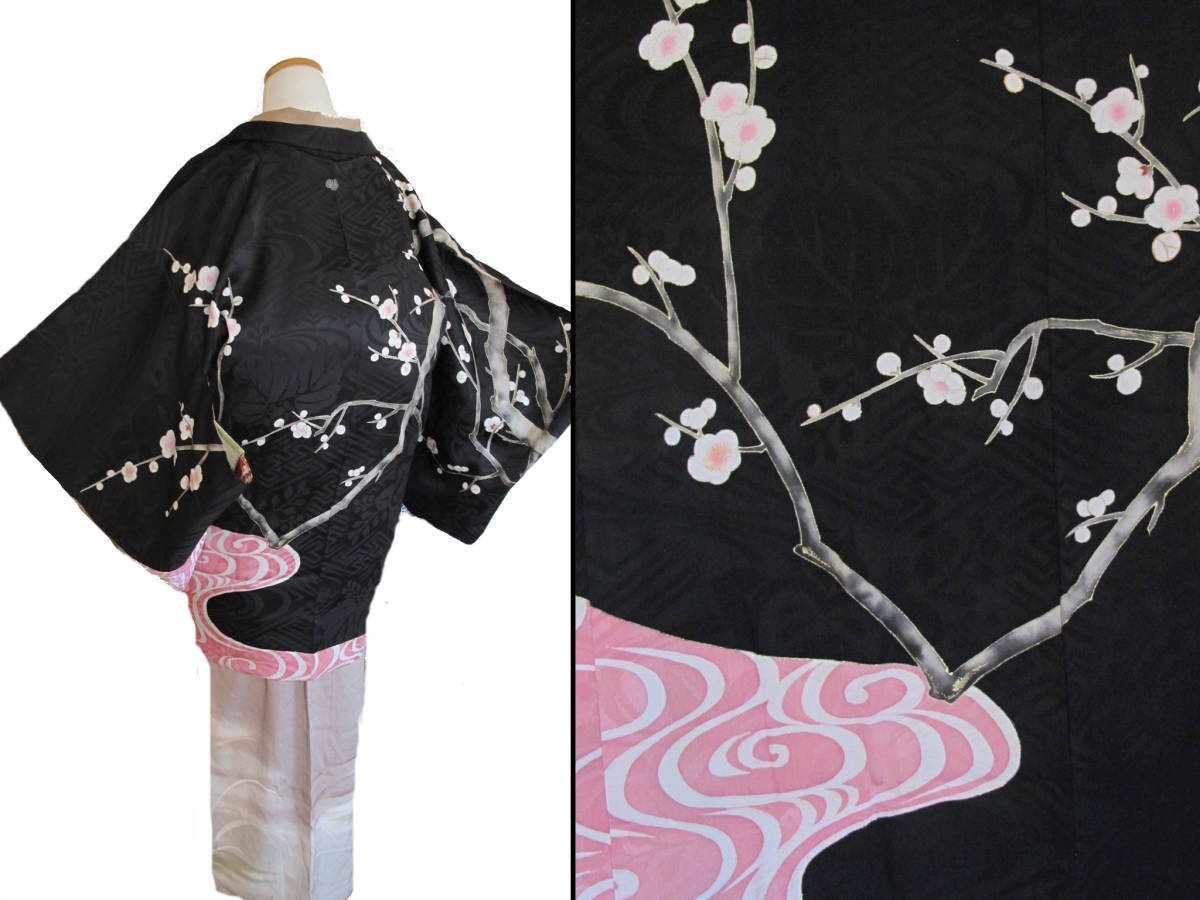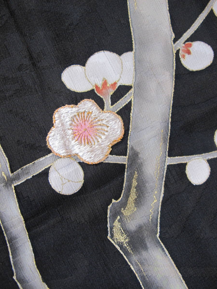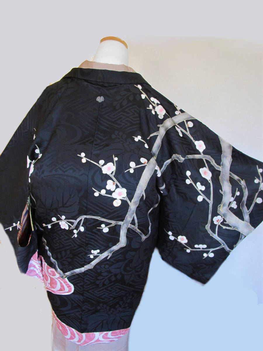 琳派の絵画を写した、枝梅と流水のアンティーク黒羽織です。 金彩、刺繍入り。染め一つ紋です。 羽裏も知的な切り嵌め模様で、とても粋なセンスの方のこだわりの御誂えと思われる素晴らしいお品です。 |
