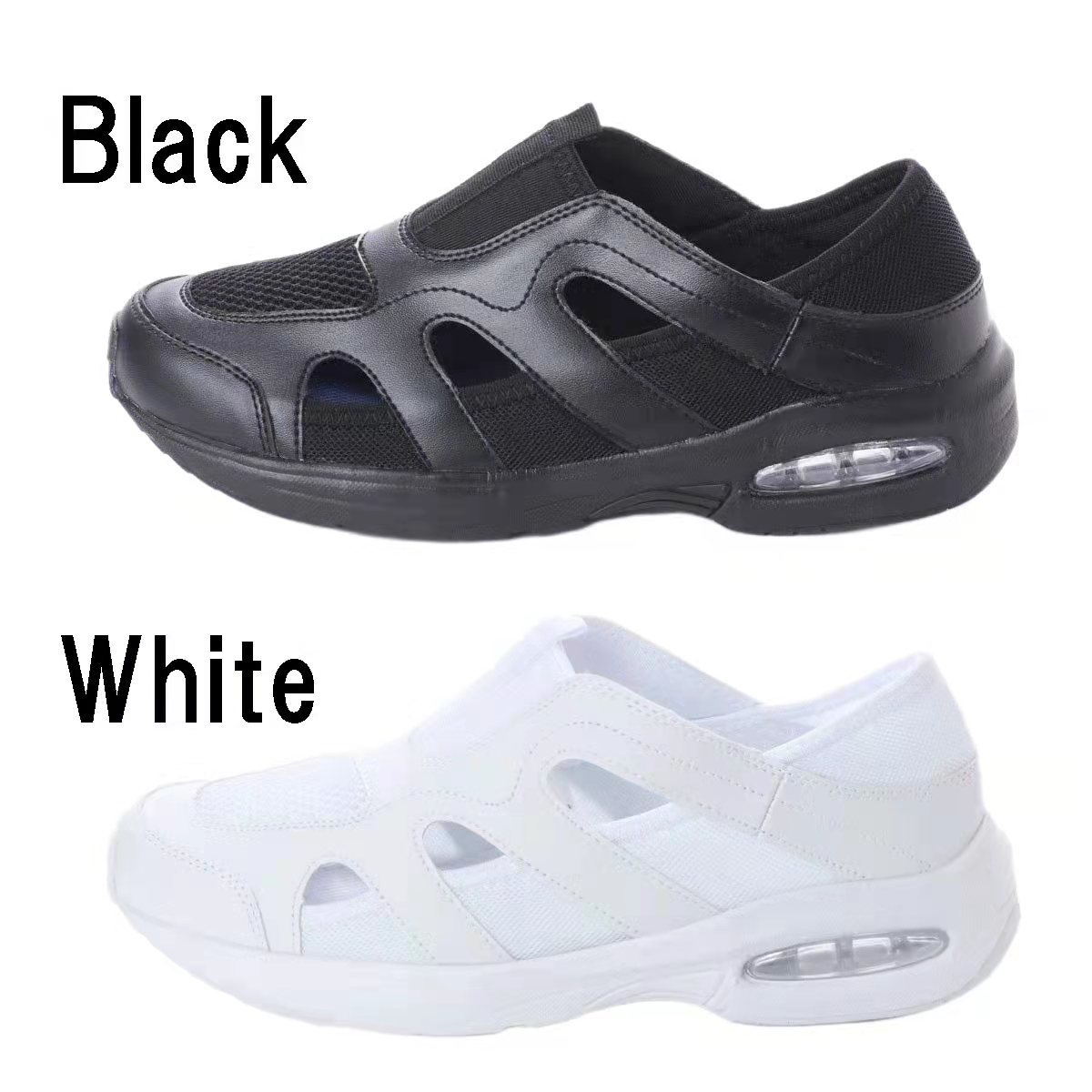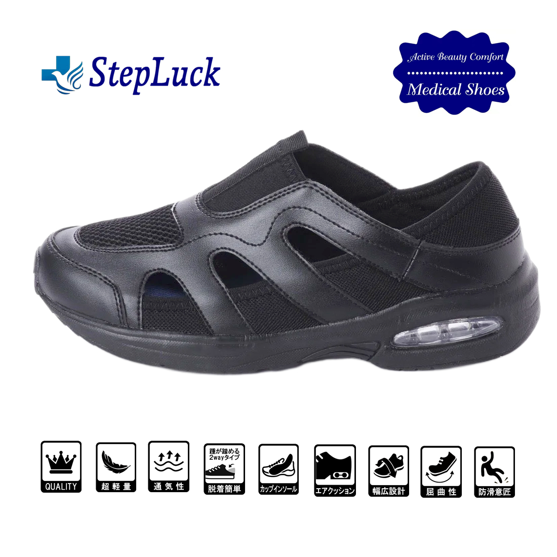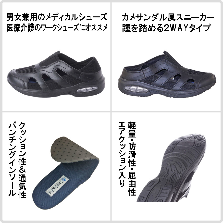 サンダルの通気性とスニーカーの動きやすさを両立し、長時間の使用でも足が疲れにくく、脱ぎ履きがしやすいので、医療・介護・オフィスの現場で大活躍する1足です。