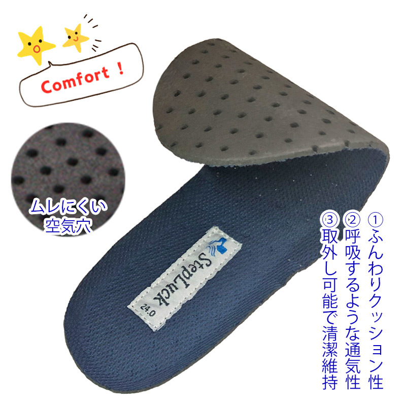 取り外せるカップインソールは洗濯可能、靴の中をいつも清潔な状態にでき、なおかつクッション性と通気性を備えているので、履き心地が抜群。