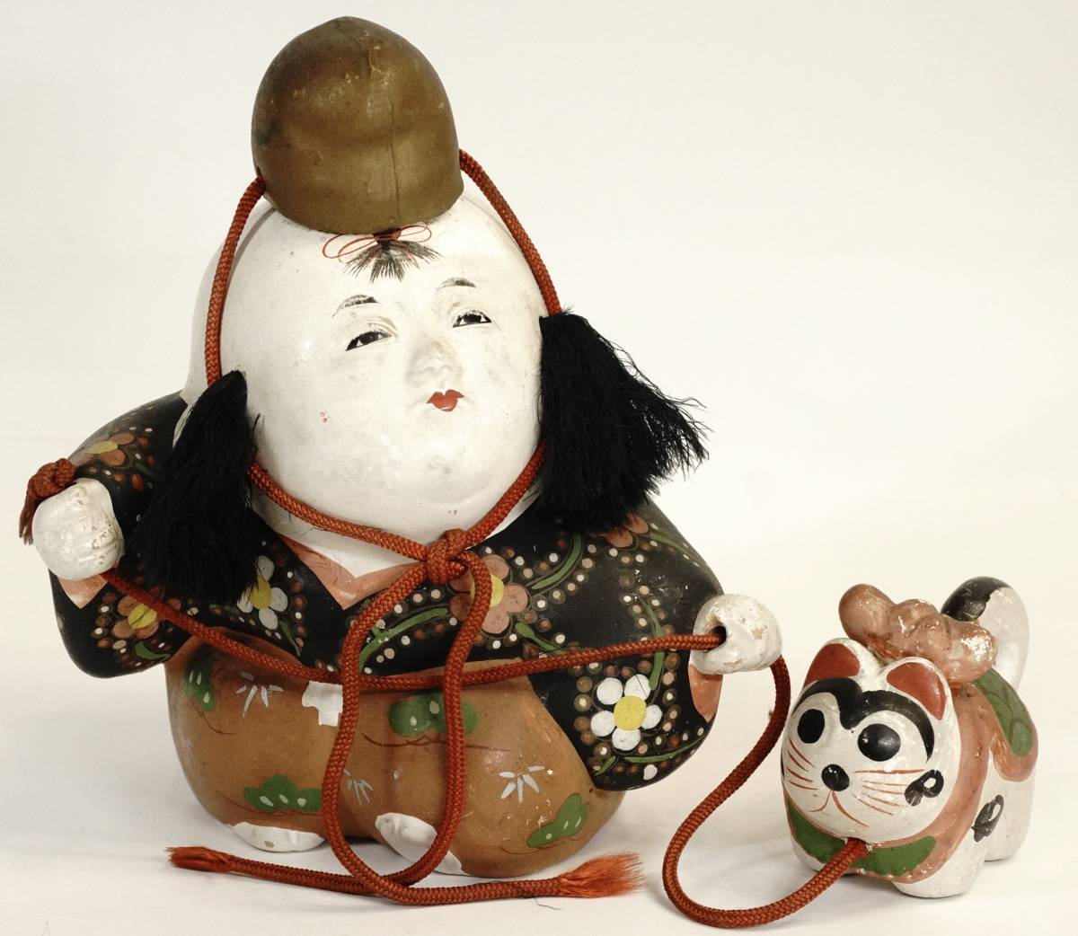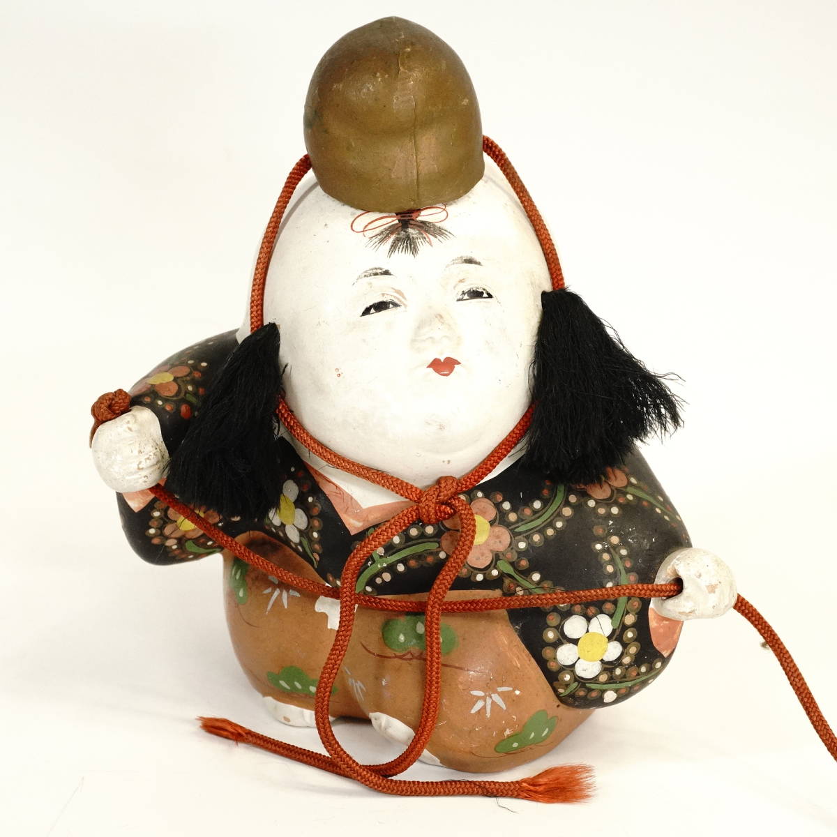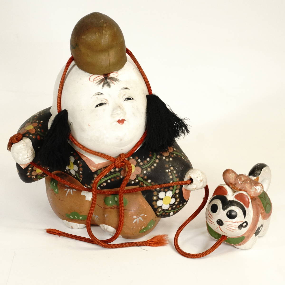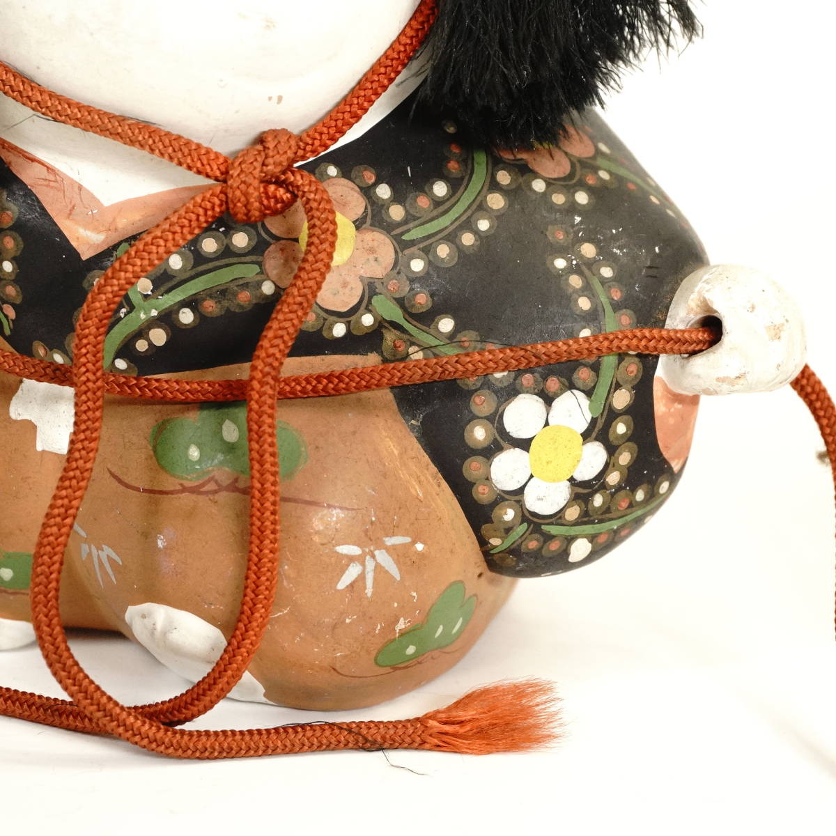 日本のアンティーク 大正〜昭和初期 陶器製 御所人形 犬引き 幅15cm 高さ17cm(童子) 絵付け、味わい、愛らしい佇まいが素敵です! IKT411