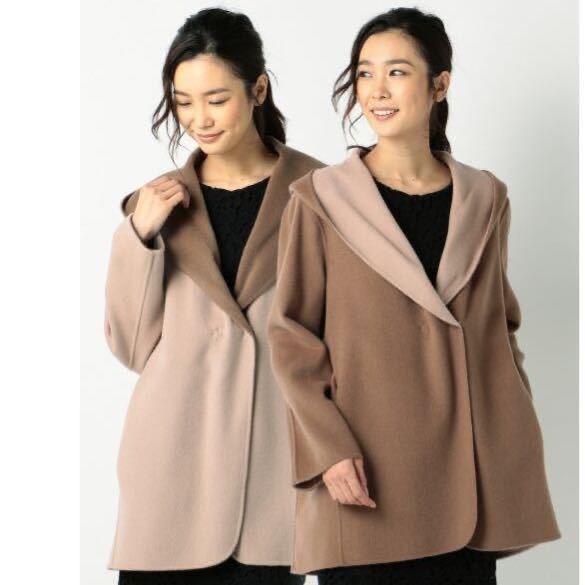 【美品】自由区 定価4.3万 リバーウール コート 38/Mサイズ相当 ピンク×キャメル レディース リバーシブル フード付き ミディアム丈